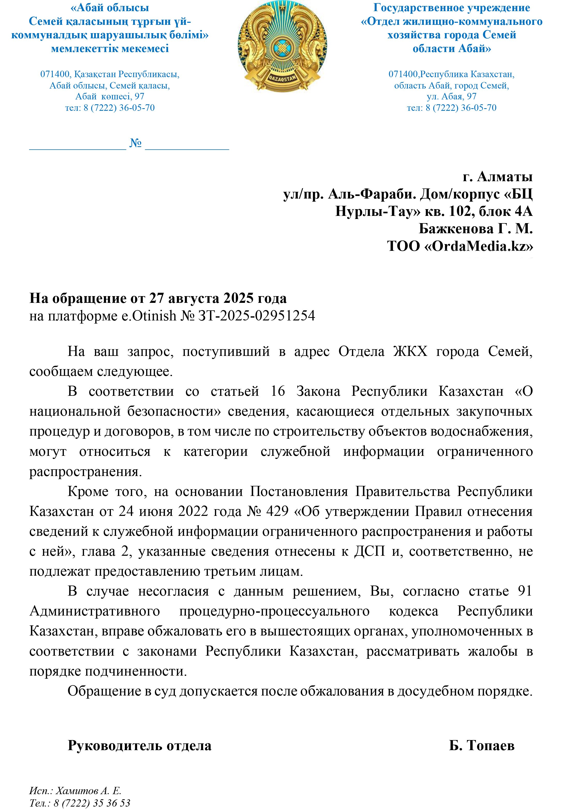 «Между ГУ „Отдел жилищно-коммунального хозяйства и жилищной инспекции города Семея“ и ТОО „Info Tech System“ заключён договор на выполнение работ по строительству магистральных сетей водоснабжения в посёлке Восход на сумму 253,1 млн тенге особым порядком на основании закона „О государственных закупках“. Однако специалисты ДВГА установили необоснованное проведение государственных закупок особым порядком, поскольку отсутствуют документ об отнесении объекта к секретным и приказ об отнесении сведений к информации ограниченного распространения».комментировали ситуацию госорганы в официальном ответе жителям.