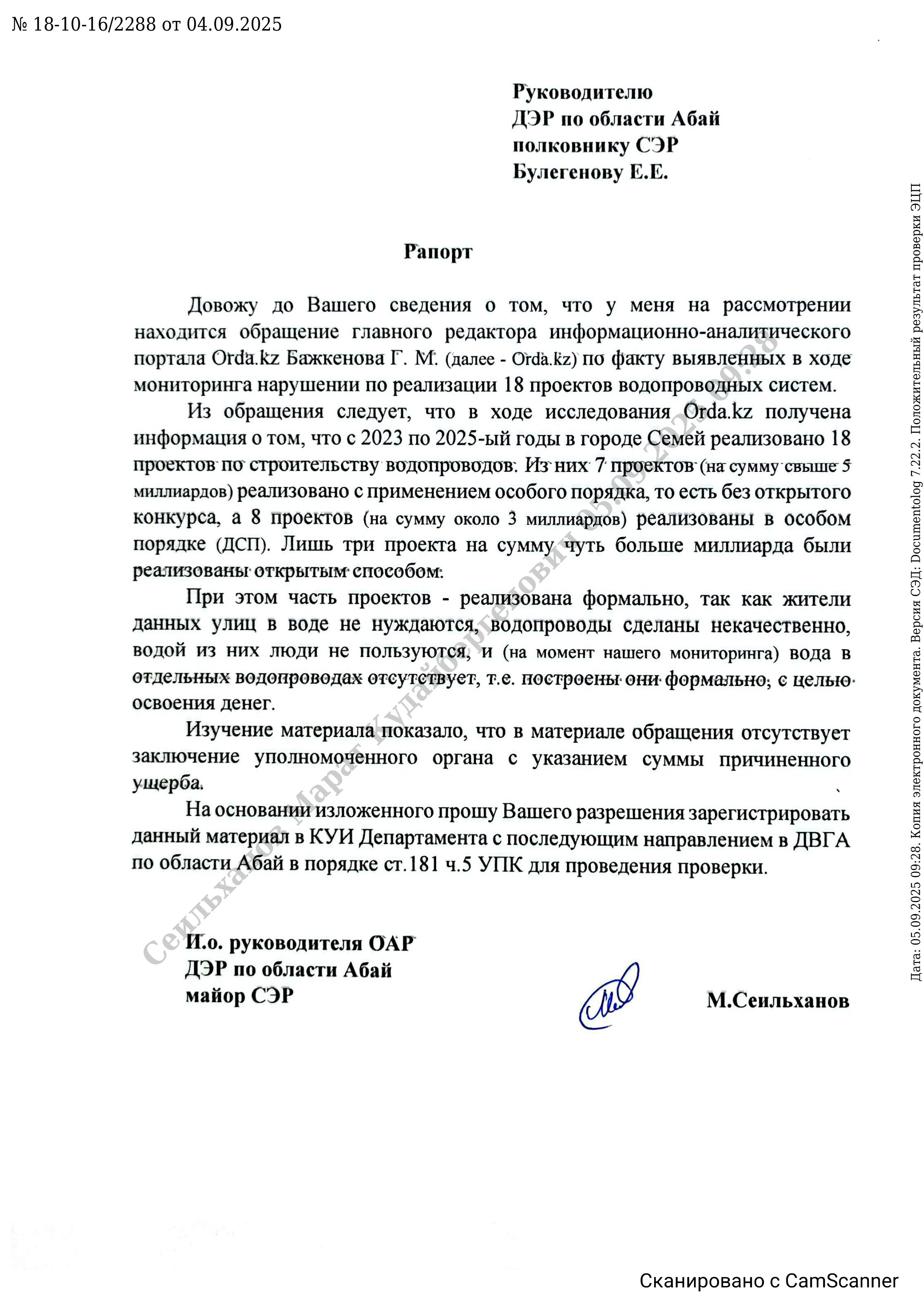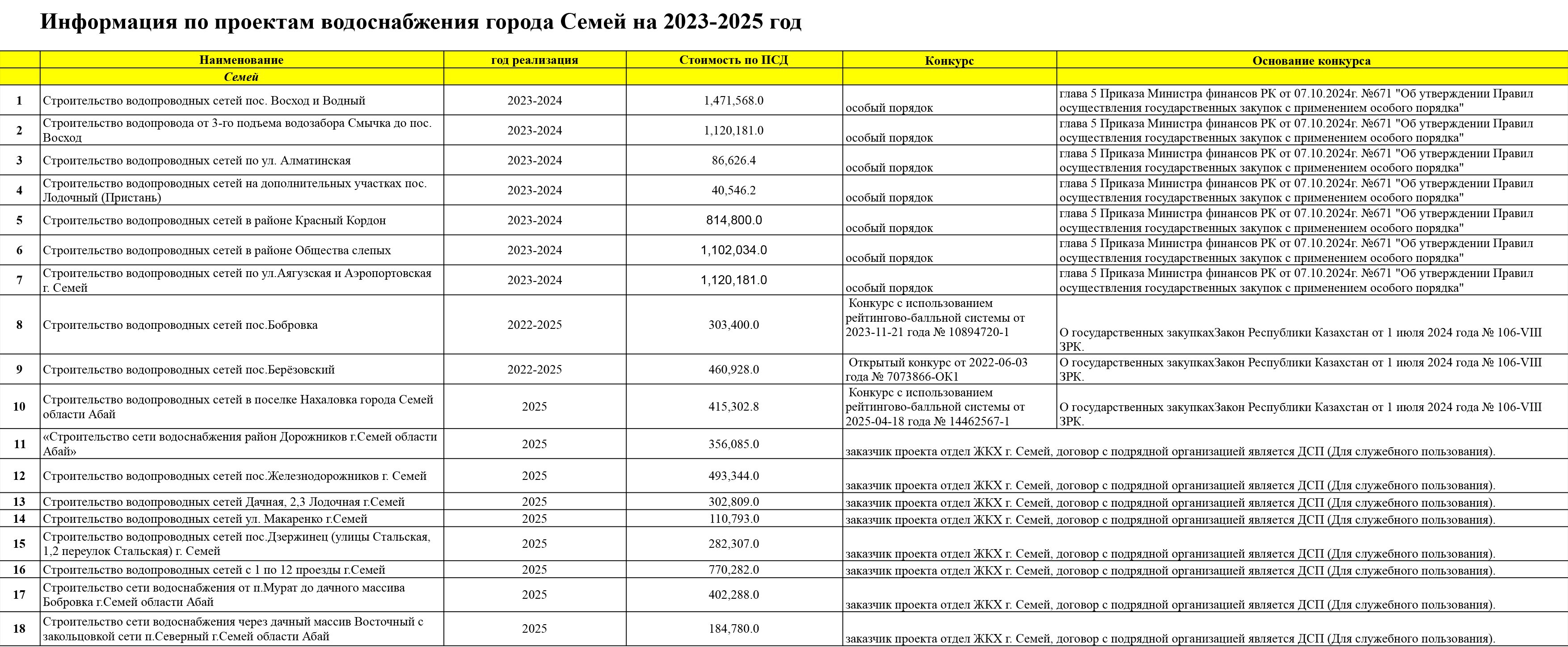 Согласно ответу ЖКХ, в 2023–2025 годах в Семее профинансировали строительство 18 водопроводов. Из 18 договоров на общую сумму около 10 миллиардов тенге прозрачно и открыто деньги осваивались лишь по трём договорам на один миллиард 178 миллионов тенге.
