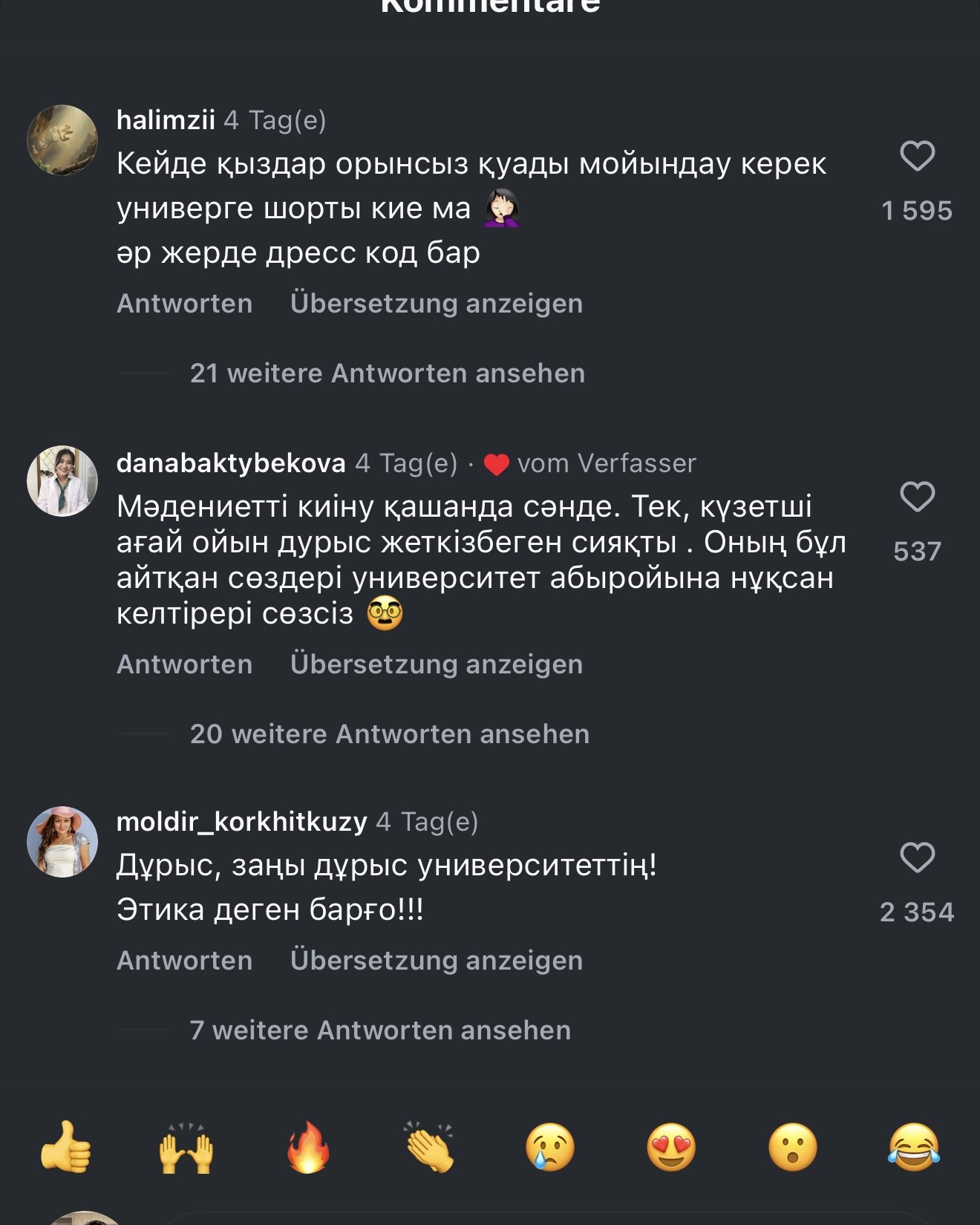 Ещё один скандал в казахстанских соцсетях разгорелся после публикации видео из Южно-Казахстанского государственного университета имени М. Ауэзова. Девушку не пустили в деканат за печатью из-за внешнего вида… Девушка была в белой рубашке и чёрных шортах, но охранник заявил: «Мы все будем на тебя смотреть, если зайдёшь в таком виде».