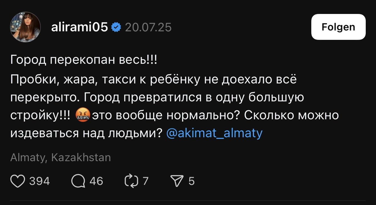 «Город перекопан весь!!! Пробки, жара, такси к ребёнку не доехало — всё перекрыто. Город превратился в одну большую стройку!!! Это вообще нормально? Сколько можно издеваться над людьми?» негодует алматинка в соцсетях.