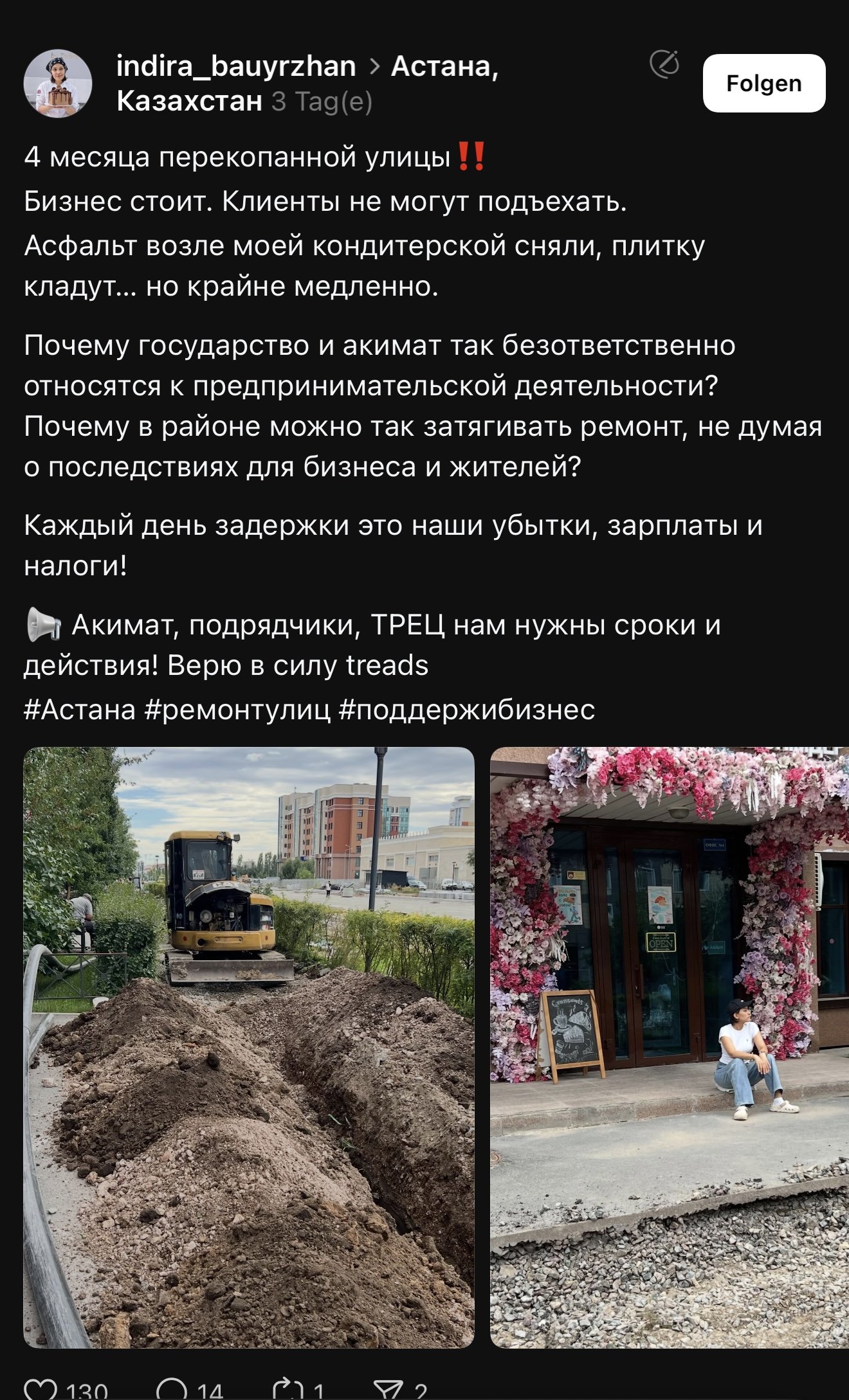 Похожие жалобы звучат и из Астаны. Одна из пользовательниц Threads заявила, что дорожные работы идут уже четыре месяца, из-за чего страдает малый бизнес: