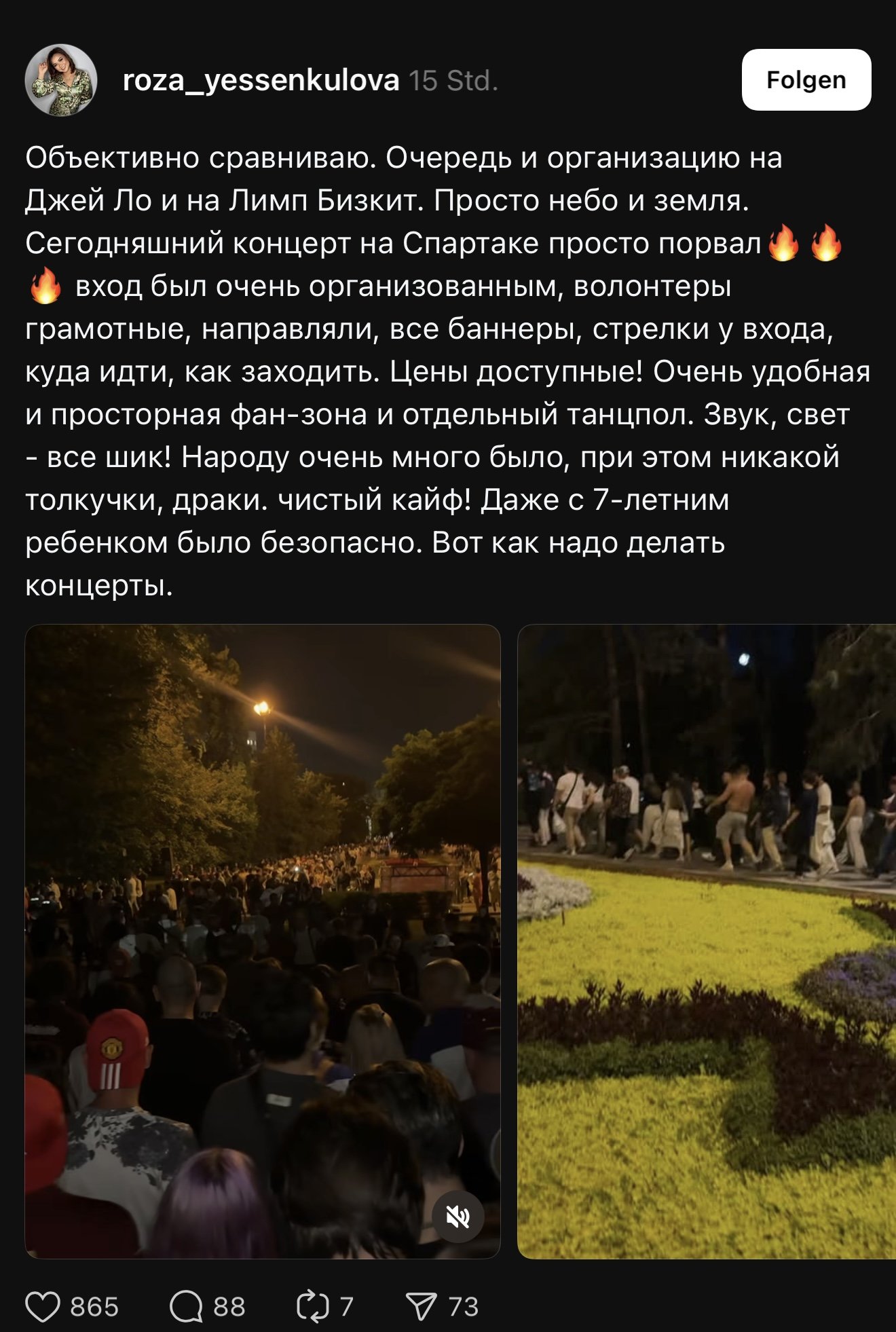 «Объективно сравниваю. Очередь и организацию на Джей Ло и на Лимп Бизкит. Просто небо и земля. Сегодняшний концерт на „Спартаке“ просто порвал»,восторгается комментатор.