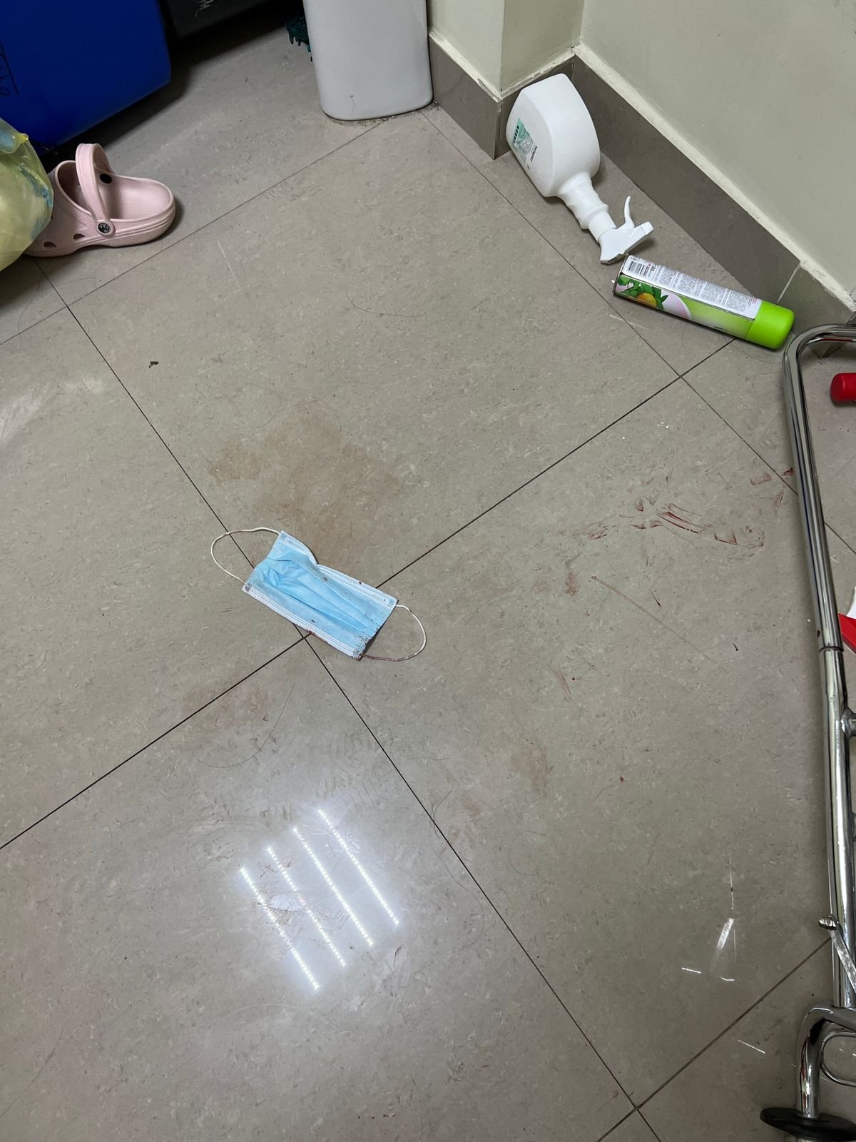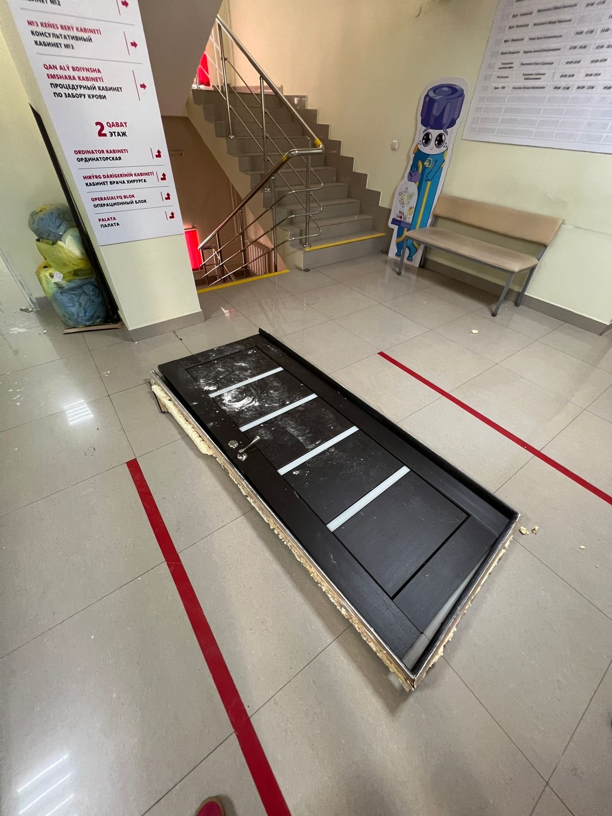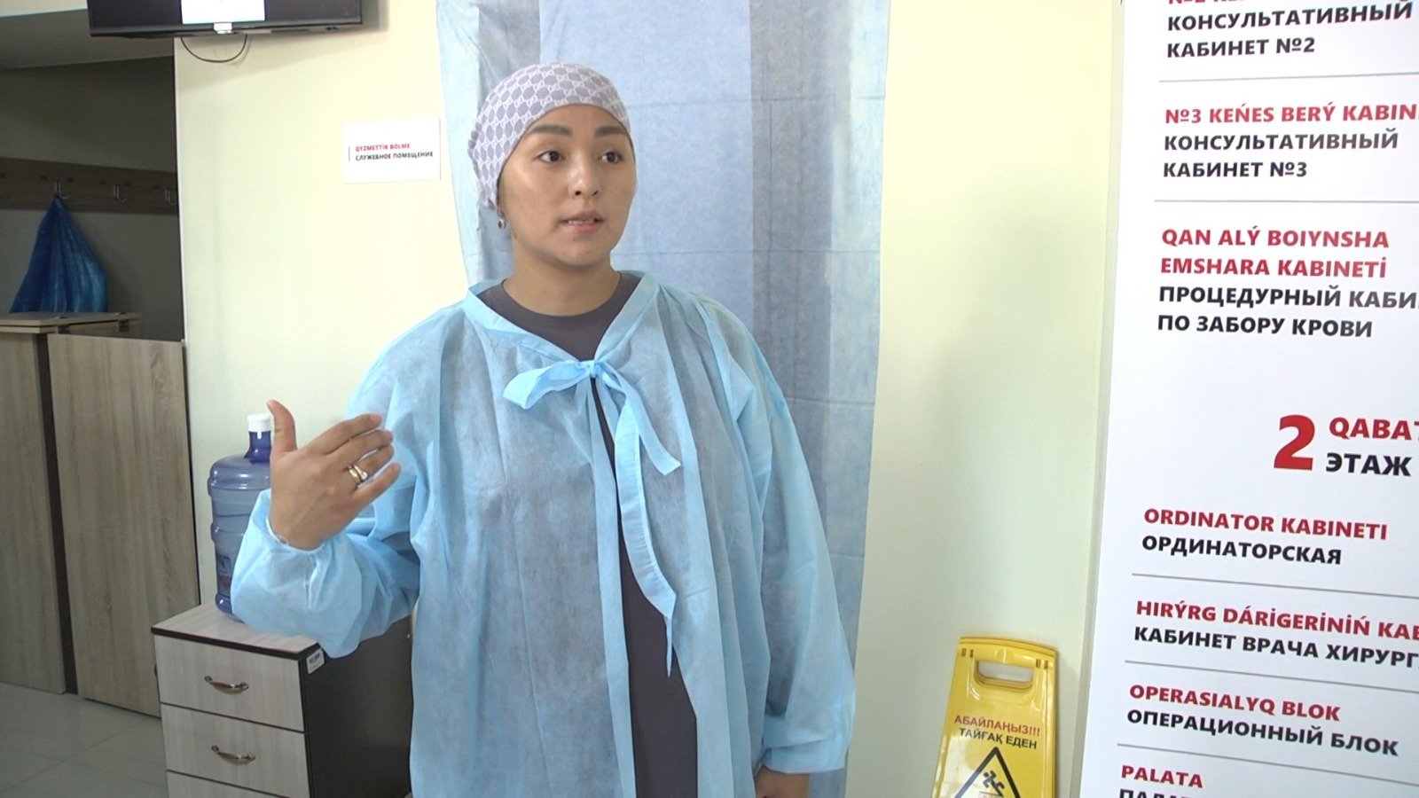 Когда женщина прошла манипуляции, её муж попытался зайти в кабинет, на котором была надпись «Посторонним вход воспрещён». Старшая медсестра Асель Тасмагомбетова в это время убирала в кабинете медицинские отходы. Она сказала посетителю, что входить в помещение нельзя.