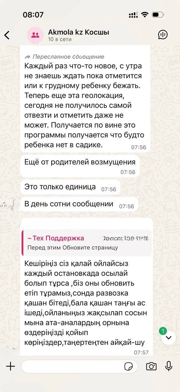 С этой проблемой к нам обратились возмущённые родители. Оказывается, жалобы поступали с самого утра 16 и 17 апреля из сёл Караоткел, Талапкер, Коянды, Жанаесиль, Кажымукан и других населённых пунктов Целиноградского района. При этом в родительских чатах пишут, что они не могут отметить ребёнка в системе: сайт не фиксирует геолокацию, даже если ребёнок находится рядом с развозкой или уже в саду.
