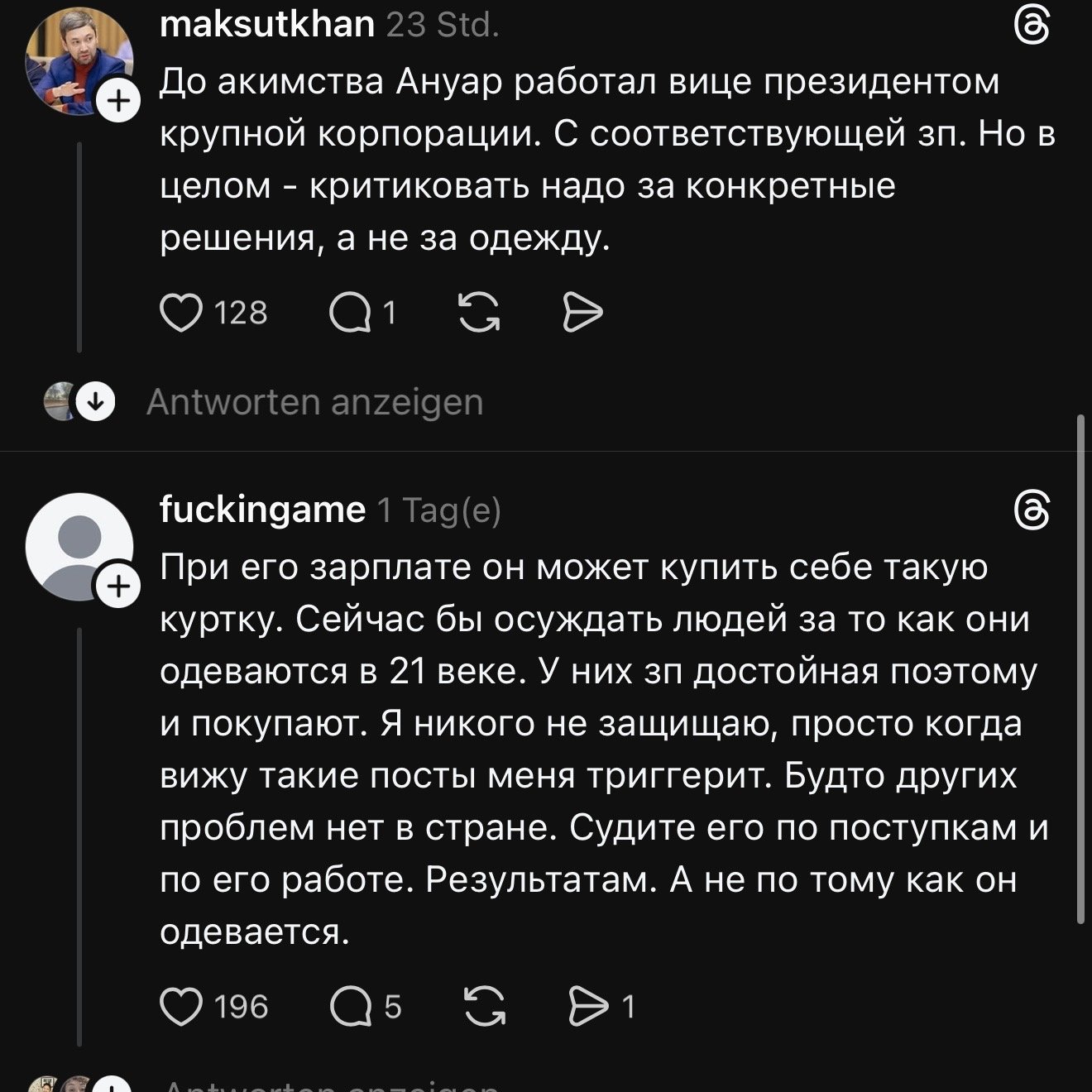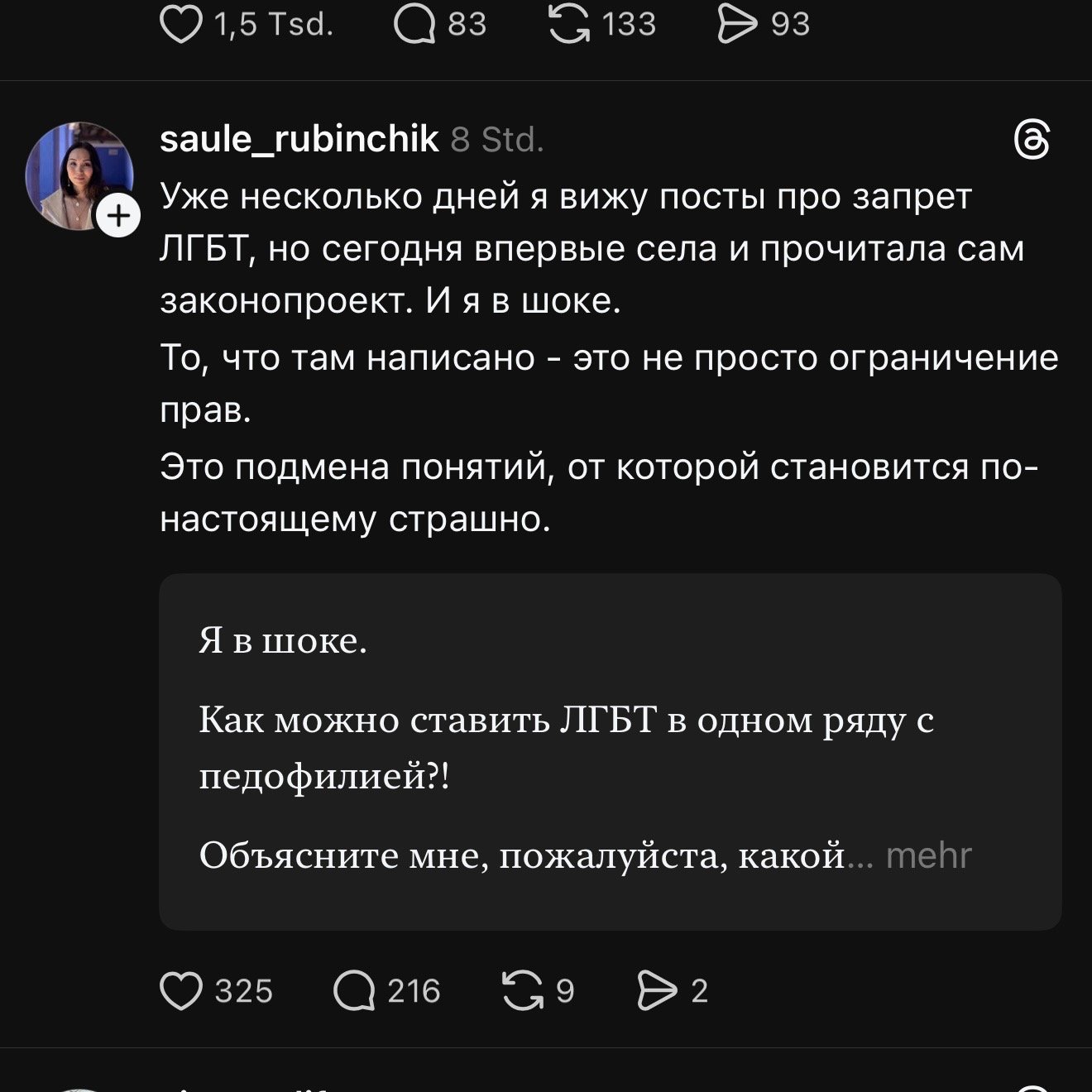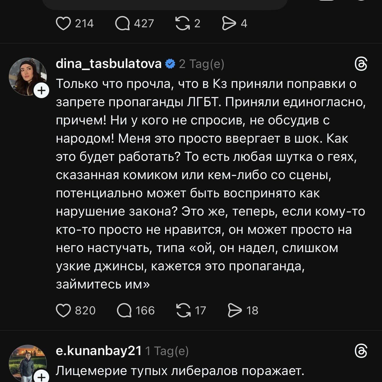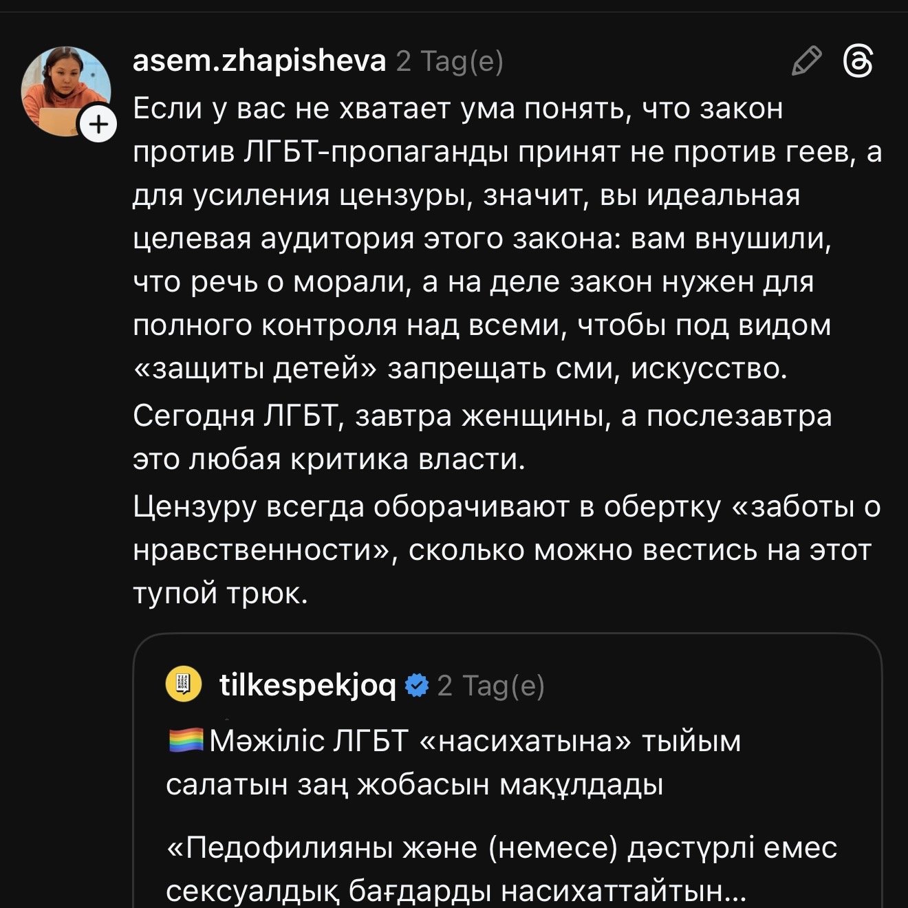 А вот те кто, кто выступает против поправок, больше высказываются в Threads и TikTok. Мысли у казахстанцев, честно говоря, тревожные — многие понимают, что закон не только об ЛГБТ, но и о цензуре. Законопроект многие раскритиковали вместе с теми, кто за него выступил в парламенте.