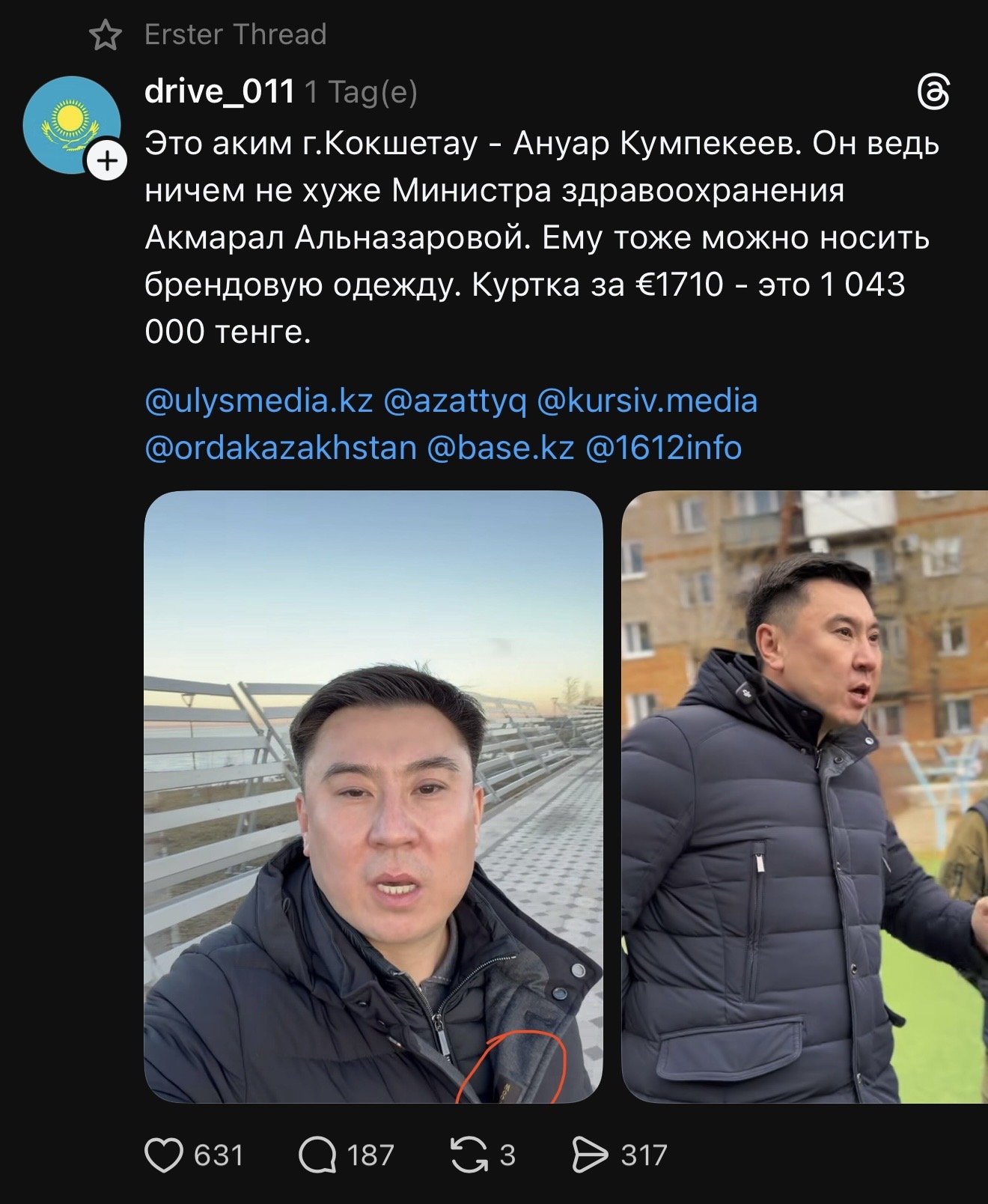 Первый пост, который нам попался, посвящён акиму Кокшетау Ануару Кумпекееву. Пользователь разглядел на фотографии, что аким носит брендовую куртку, и припомнил момент с модной Акмарал Альназаровой.