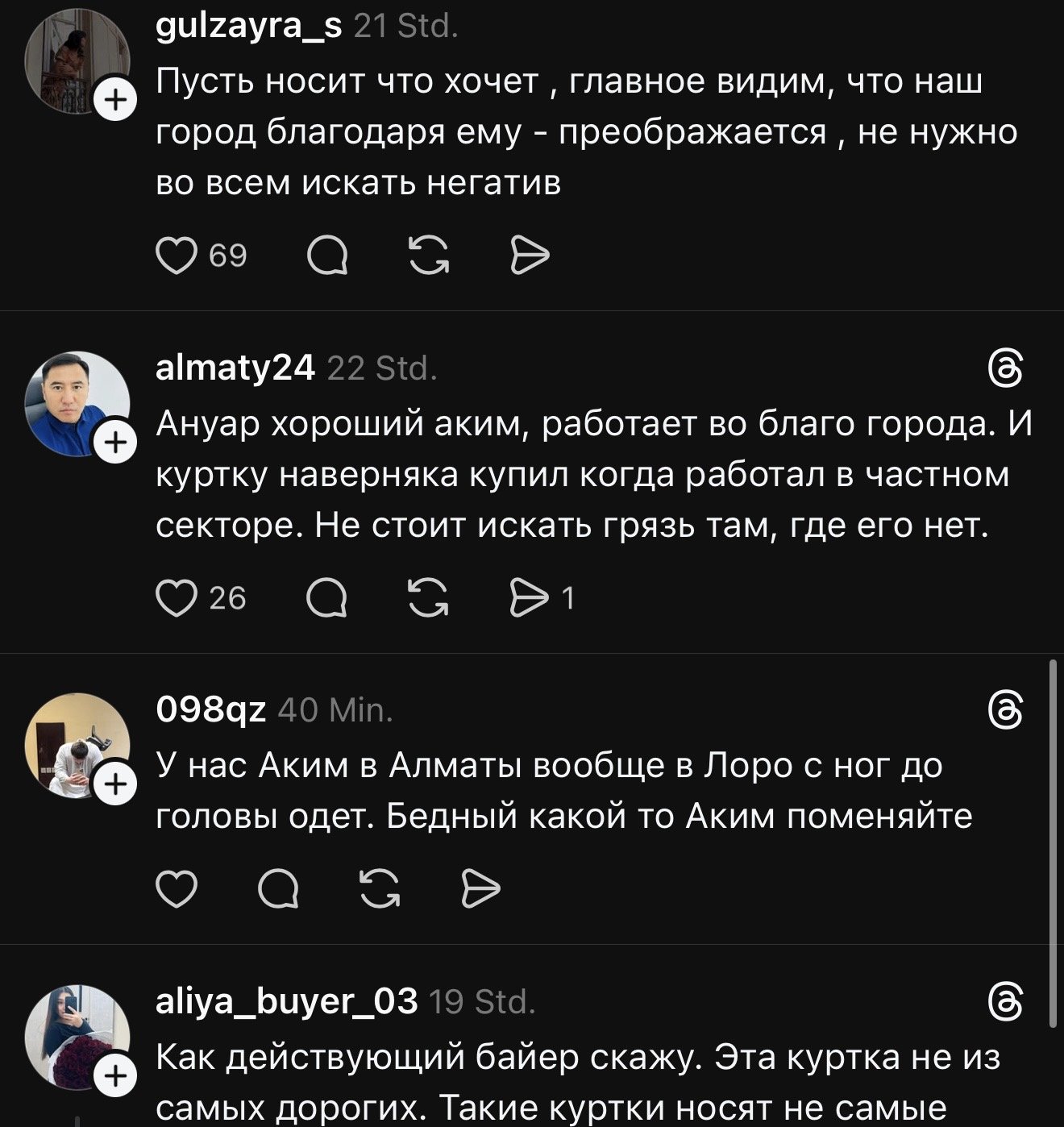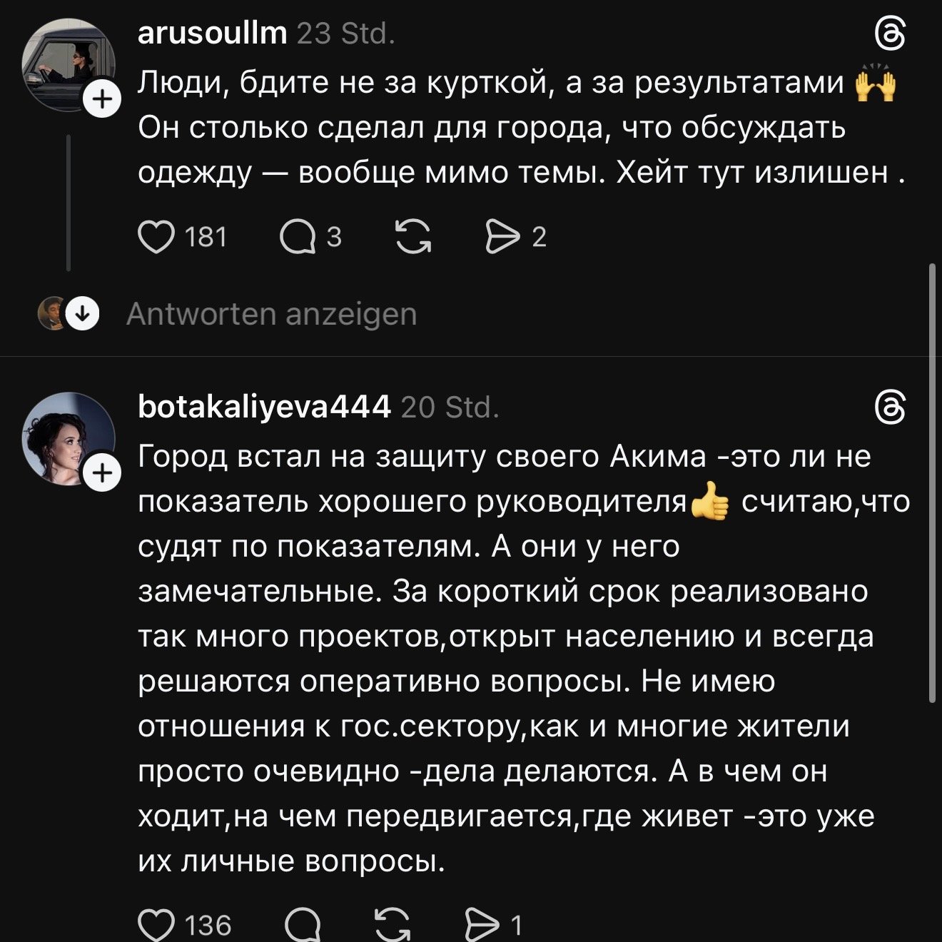 «Город встал на защиту своего акима — это ли не показатель хорошего руководителя? Считаю, что судят по показателям, а они у него замечательные. За короткий срок реализовано так много проектов, открыт к населению и всегда решаются оперативно вопросы. Не имею отношения к госсектору, как и многие жители, просто очевидно — дела делаются. А в чём он ходит, на чём передвигается, где живёт, это уже их личные вопросы», заявил другой комментатор.