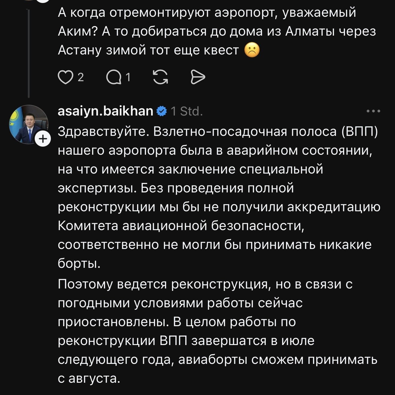 А уже на следующий день ответ акима стал вирусным. Он получил свыше 11 тысяч лайков и общественное признание.