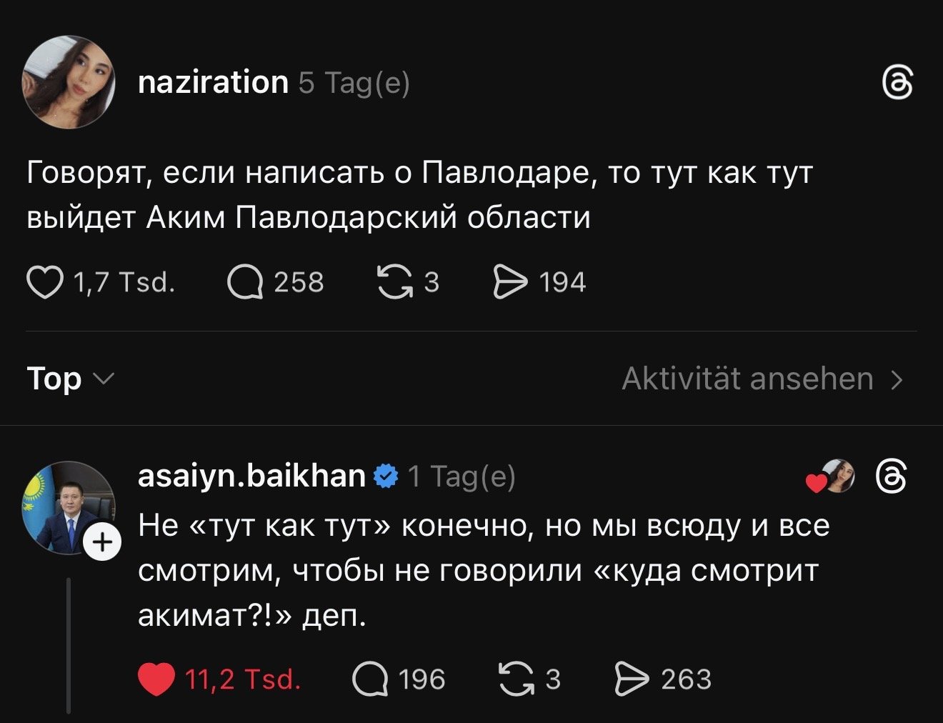 В Threads мы, кстати, заметили, что аким активно отвечает на обращения граждан.