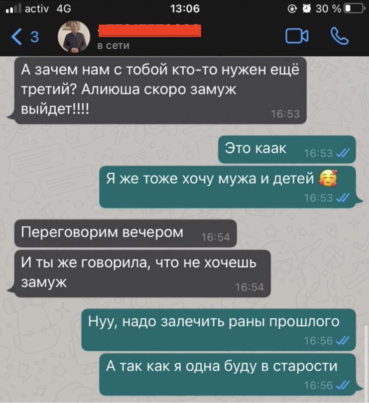 До 17 лет я была возле родителей и была обычным ребёнком. Но после смерти моей мамы Толеутай Рахимбеков стал предлагать сожительство. Когда мы остались одни, он начал домогаться. Свидетельство тому одна из переписок в ватсапе. Он напивался сам, я принимала антидепрессанты, закрывала на ночь двери на замок, а просыпалась уже с открытыми. На все его предложения о сожительстве я отказывалась.