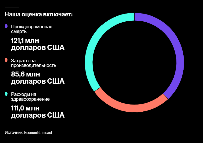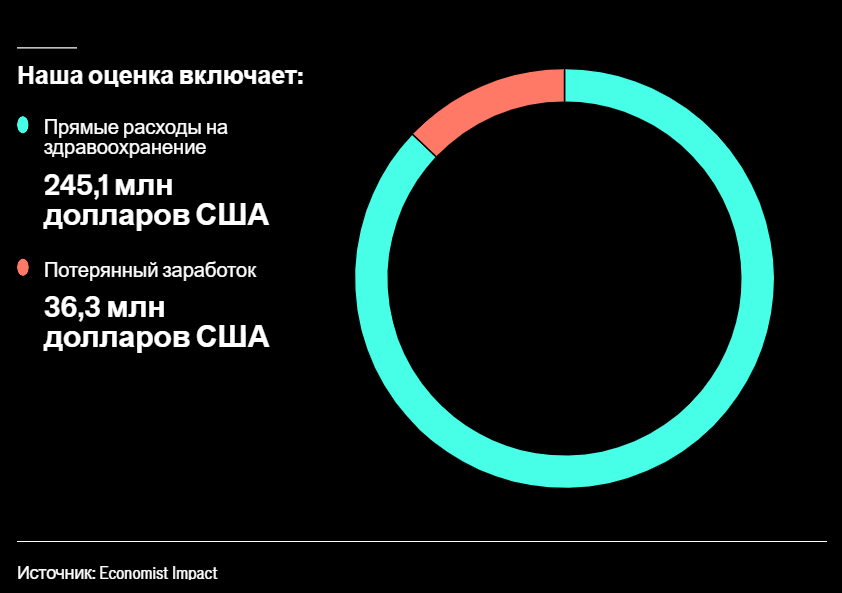 Авторы отчёта отнесли сюда боли в пояснице и шее, остеоартрит коленного сустава и ревматоидный артрит у пожилых людей. По оценке экспертов The Economist Impact, сейчас только прямые расходы на лечение этих болезней в Казахстане составляют 245,1 млн долларов в год. Плюс 36,6 млн они оценивают как упущенный заработок.