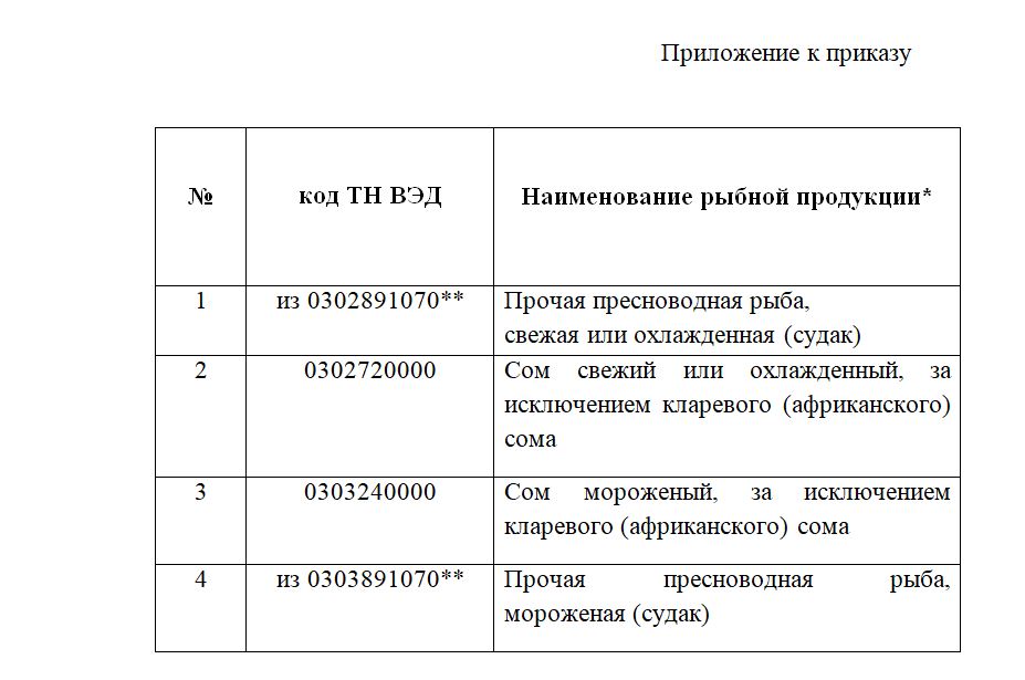 «Приказываю ввести запрет на вывоз отдельных видов рыбы мороженой, свежемороженой или охлаждённой (сом и судак) (коды единой товарной номенклатуры внешнеэкономической деятельности Евразийского экономического союза (коды ТН ВЭД ЕАЭС) из 0302891070, 0302720000, 0303240000, из 0303891070) согласно приложению к настоящему приказу, сроком на 6 месяцев», – говорится в документе.