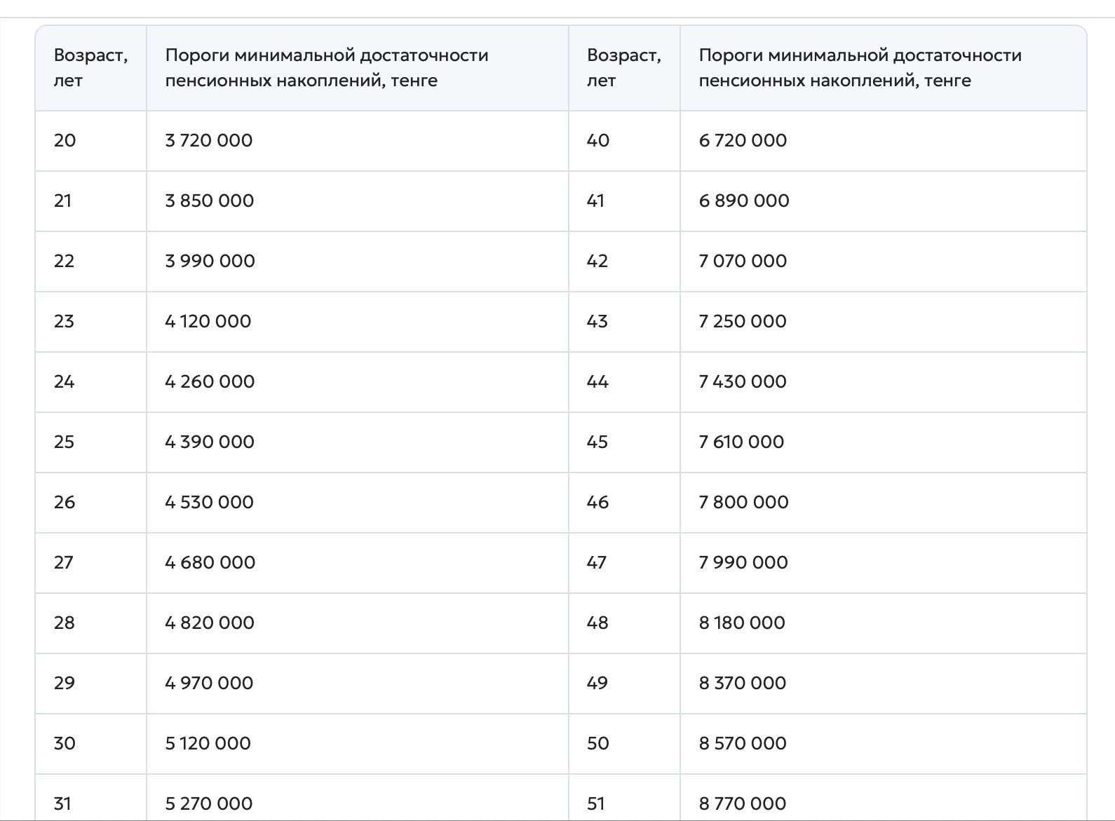 Единый накопительный пенсионный фонд опубликовал новые пороги минимальной достаточности — в 2026 году они подрастут примерно на 10 %, сообщает Orda.kz.