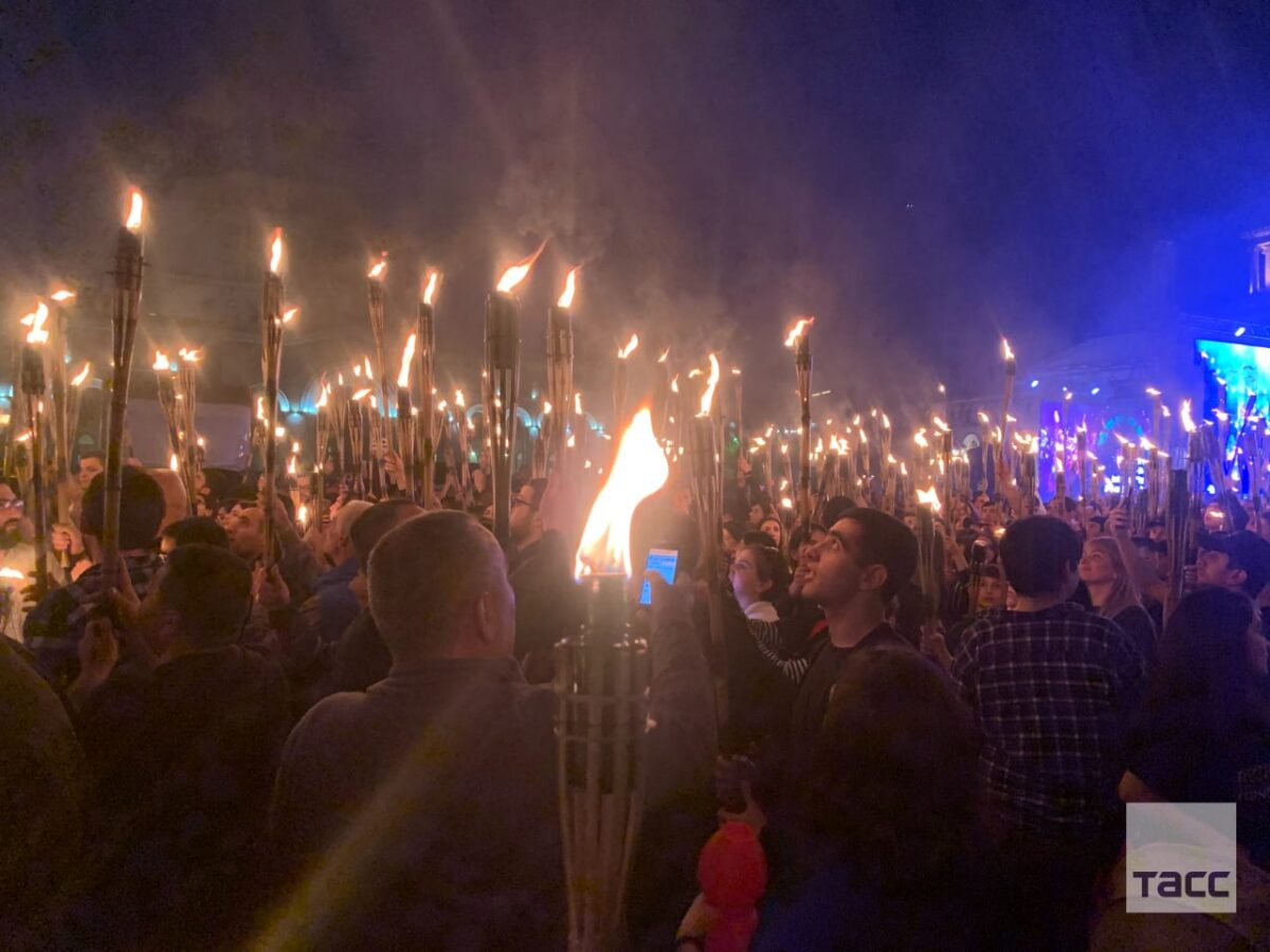 В шествии принимают участие молодые люди, сообщает ТАСС. С зажжёнными факелами и флагами Армении и Арцаха (Карабаха) они движутся от площади Республики к мемориалу «Ласточкино гнездо», посвящённому геноциду армян.