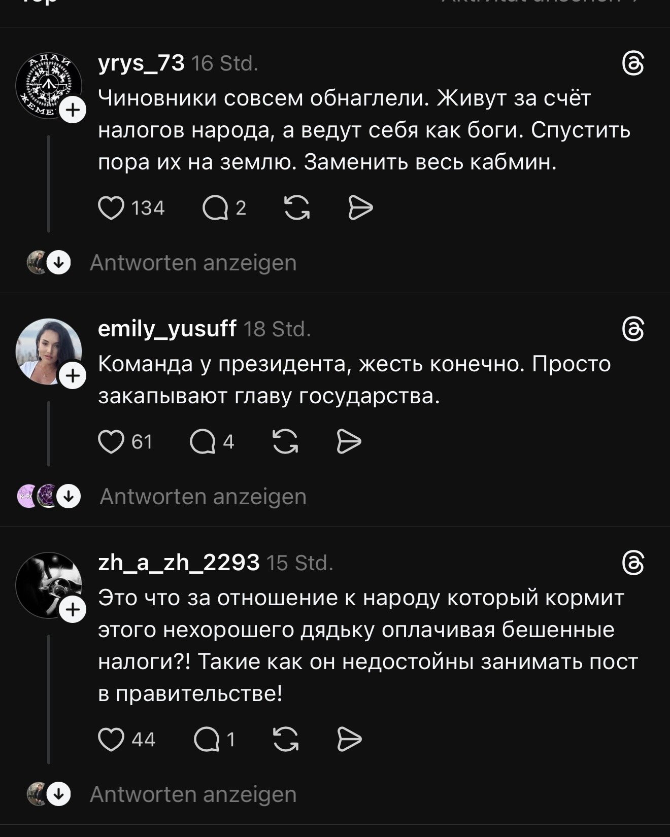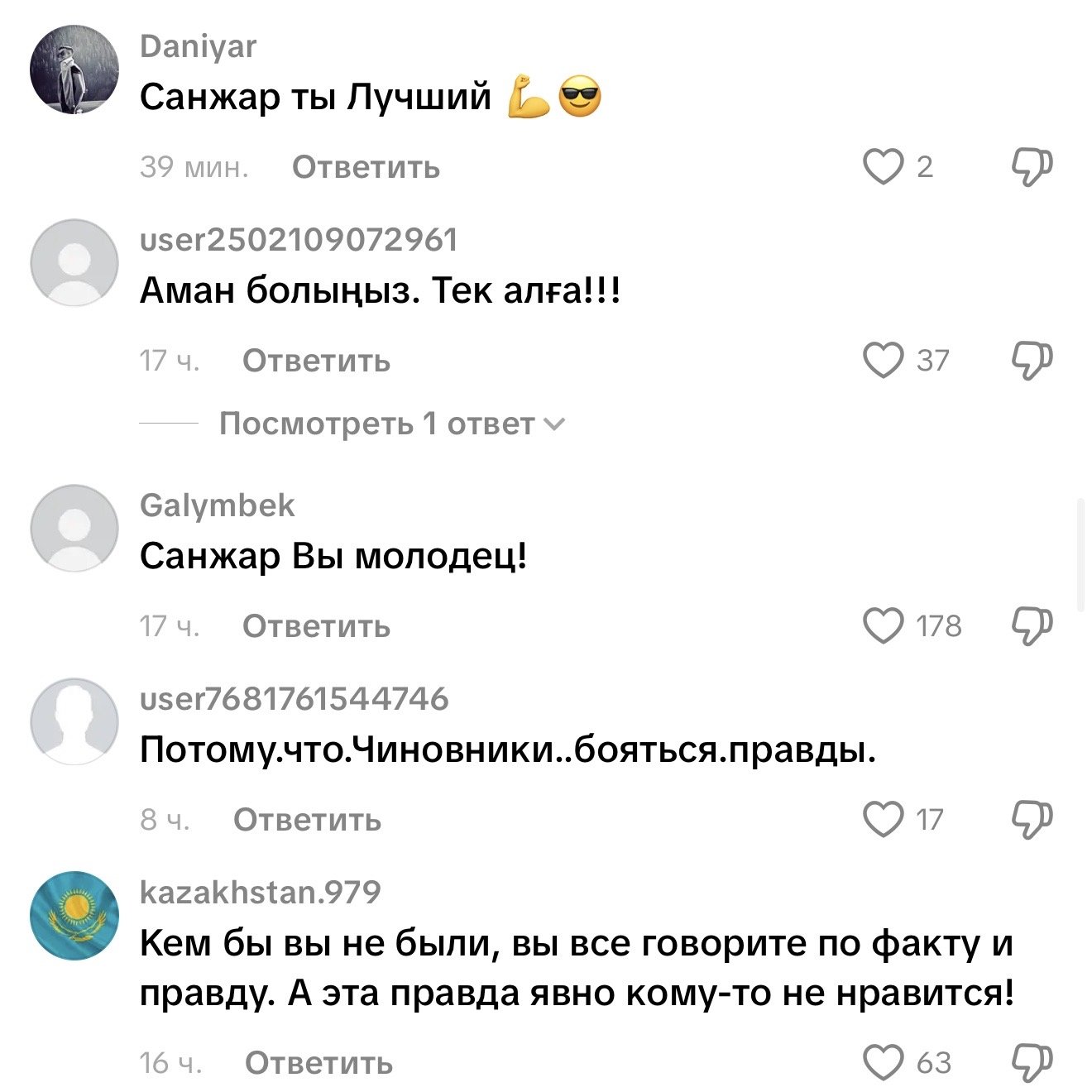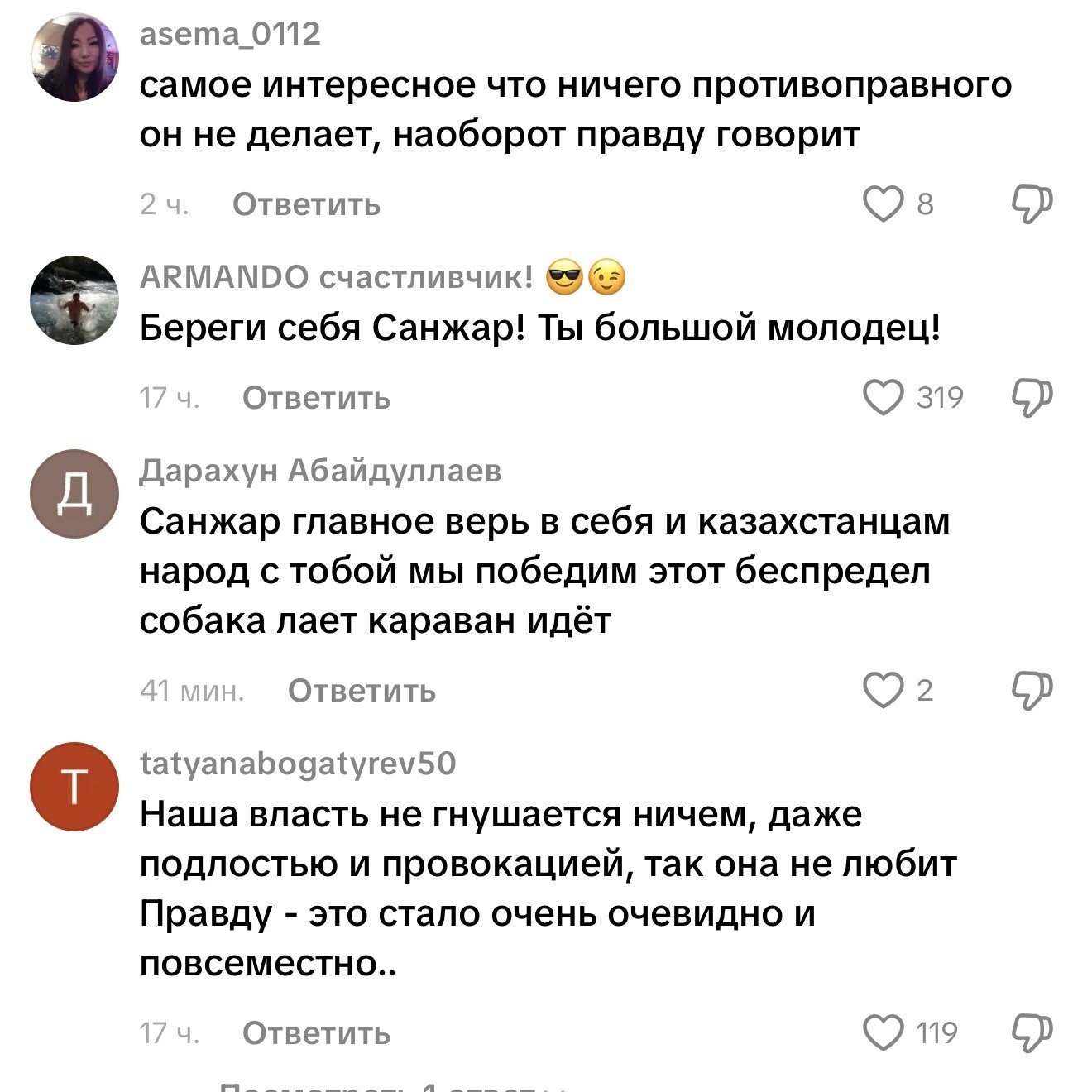 «Вчера только заплатила налоги и прям жаба душит! Почему наши деньги уходят на оплату вот этого недоразумения?! Почему государство тратит бюджет на горе-блогеров, которые придумывают чёрные истории про Санжара? На полицейских, которые заняты не поиском преступников, а следят за ним? На айтишников, которые блокируют Санжара, Асхата и Вадима Борейко в социальных сетях? Почему наш бюджет сливается так тупо и бездарно? Срочно нужна реформа не только МВД, но и всей нашей страны!»