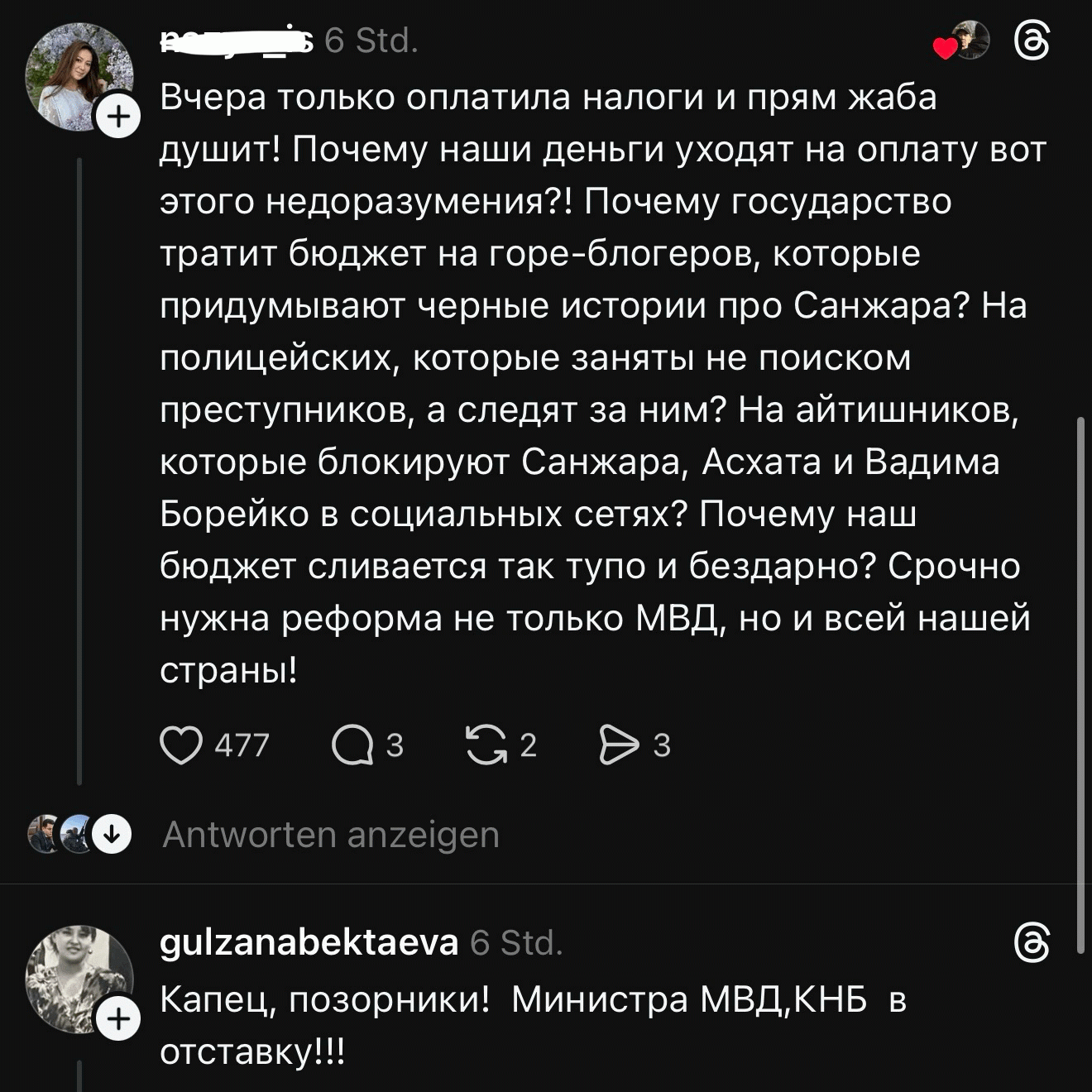 «Вчера только заплатила налоги и прям жаба душит! Почему наши деньги уходят на оплату вот этого недоразумения?! Почему государство тратит бюджет на горе-блогеров, которые придумывают чёрные истории про Санжара? На полицейских, которые заняты не поиском преступников, а следят за ним? На айтишников, которые блокируют Санжара, Асхата и Вадима Борейко в социальных сетях? Почему наш бюджет сливается так тупо и бездарно? Срочно нужна реформа не только МВД, но и всей нашей страны!»