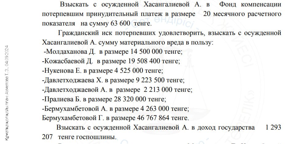 «Приговор Алмалинского районного суда города Алматы от 04.09.2024 года в отношении Хасангалиевой считаем законным и обоснованным. Доводы гражданки Хасангалиевой о том, что она по-дружески как курьер привезла потерпевшим брендовые изделия, не соответствуют действительности и полностью опровергаются материалами дела, исследованными в суде».