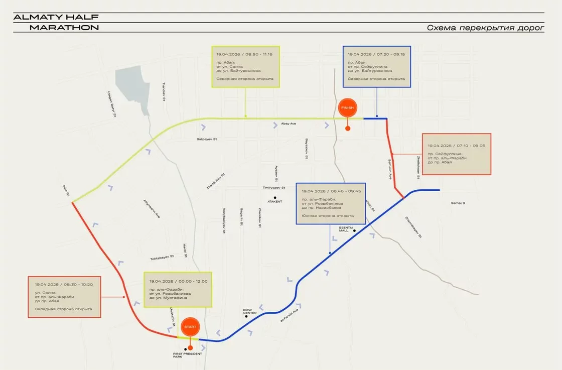 Забег Almaty Half Marathon пройдёт 19 апреля. В нём примут участие более 10 тысяч человек из 44 стран. Из-за этого с полуночи до 12:00 в городе введут временные ограничения движения.