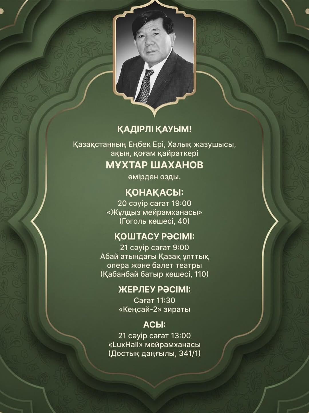 Впрочем, согласно информации, размещённой на Instagram-странице Союза писателей Казахстана, прощание с Мухтаром Шахановым состоится 21 апреля в 09:00 в Казахском национальном театре оперы и балета им. Абая в Алматы. Сами похороны, отметили авторы, состоятся в этот же день в 11:30 на кладбище Кенсай-2 в южной столице.