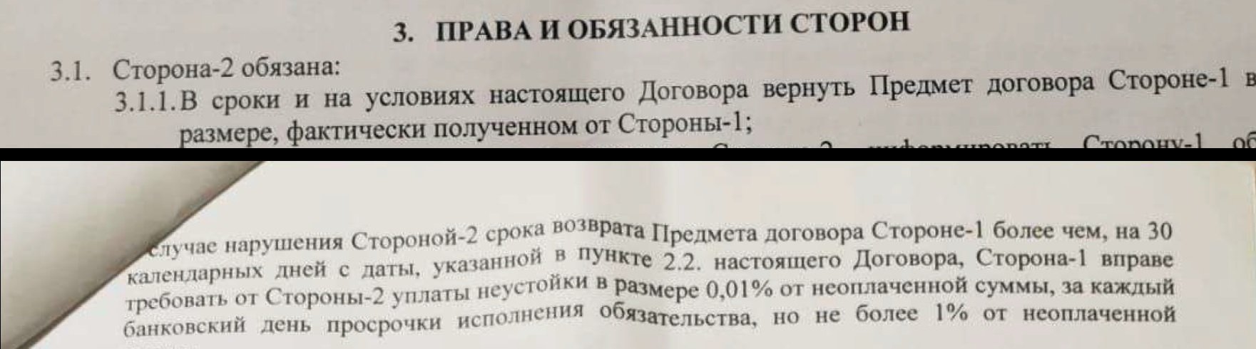 Такие пункты значились в типовых договорах, которые заключали потерпевшие с «Тендерной биржей». Как видно, в договорах речи ни о каких процентах не было. Возврат предполагался только в «фактически полученном размере». Также была прописана смешная неустойка, которая вне зависимости от срока не могла превысить 1 % от суммы.