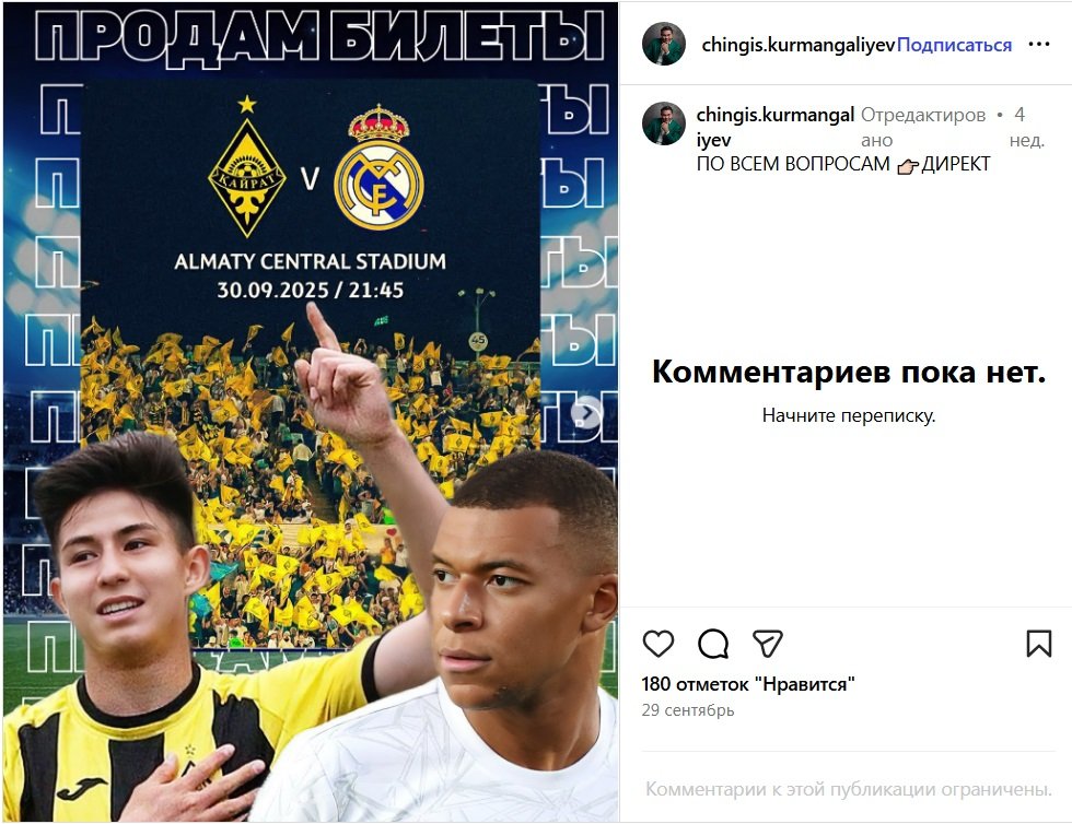 Также за день до матча Лиги чемпионов «Кайрат» — «Реал» Курмангалиев опубликовал пост с объявлением о продаже билетов с подписью: