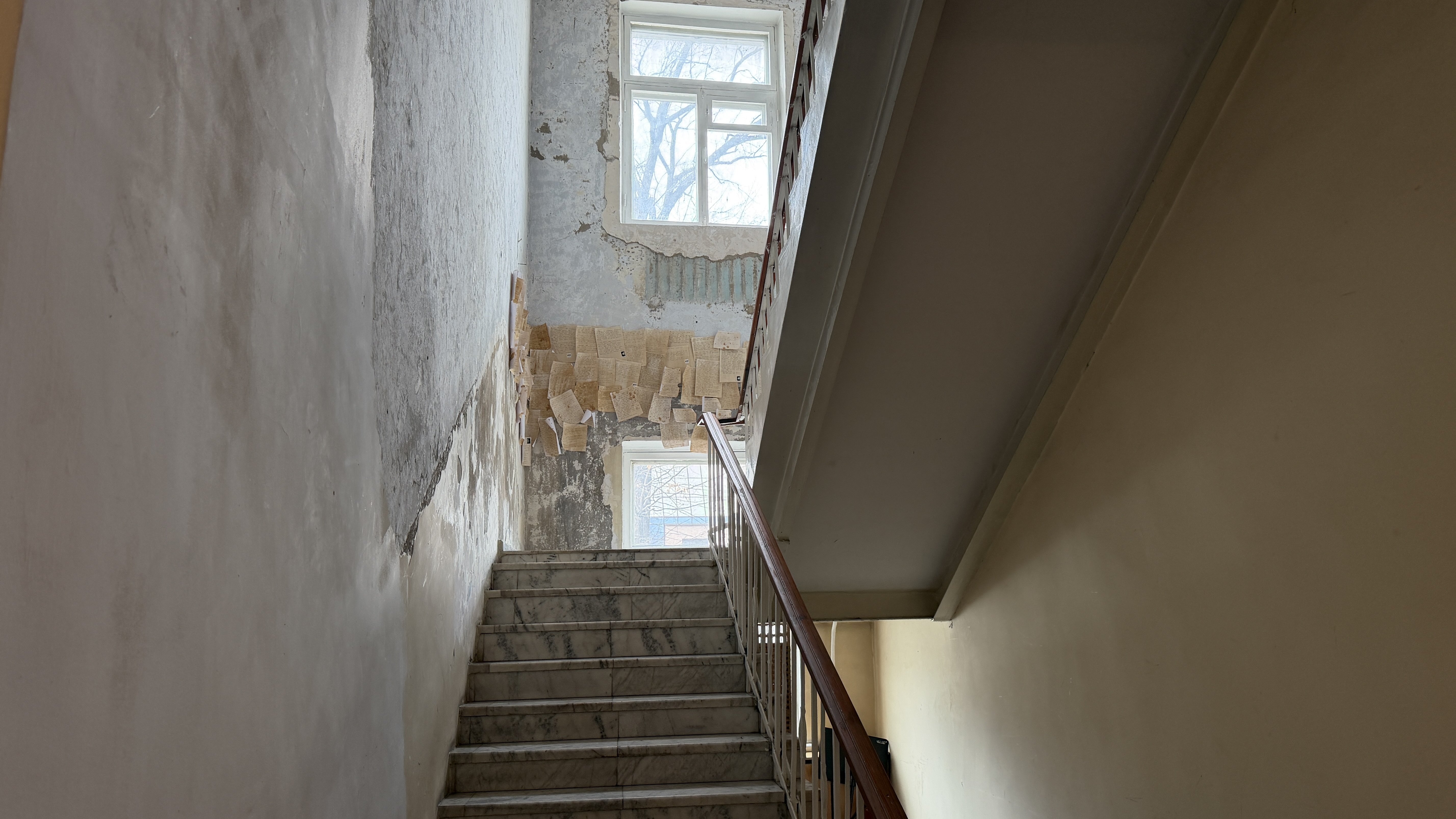 Администрация, кстати, заняла в здании второй этаж, а ведущая туда лестница обклеена записочками.