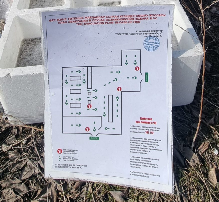Среди отходов нашлась бумага с планом эвакуации, на которой была указана фамилия бывшего директора ТОО "РТС-Розничная Торговая сеть". Речь идёт о сети магазинов COSMART. Выяснилось, что часть мусора принадлежала именно ей.