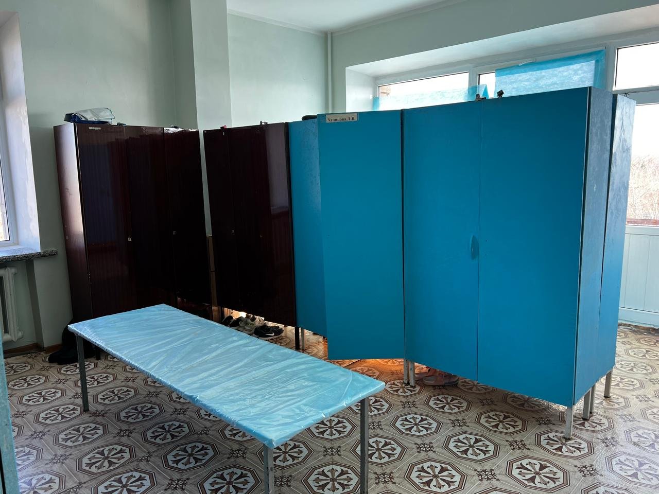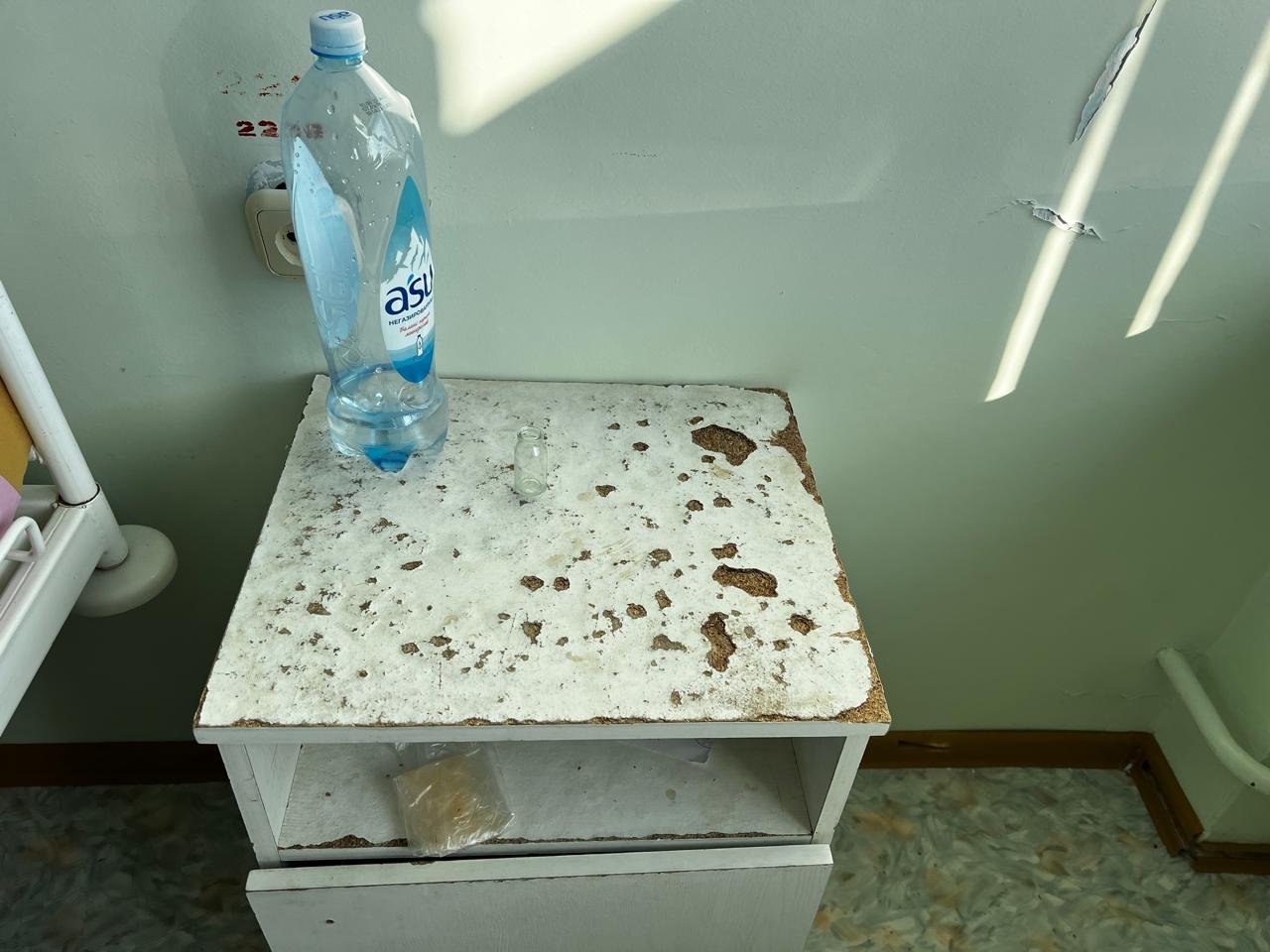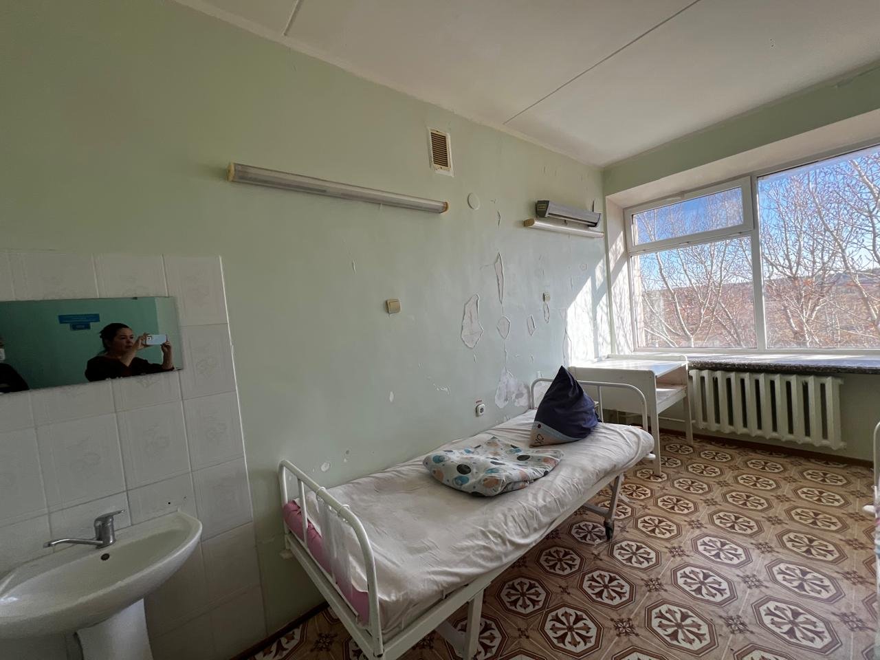 Медработники отделения говорят, что перегородка должна быть покрыта каким-то специальным материалом, а не пелёнкой. Ну и сама комнатушка, понятное дело, выглядит ещё печальнее.