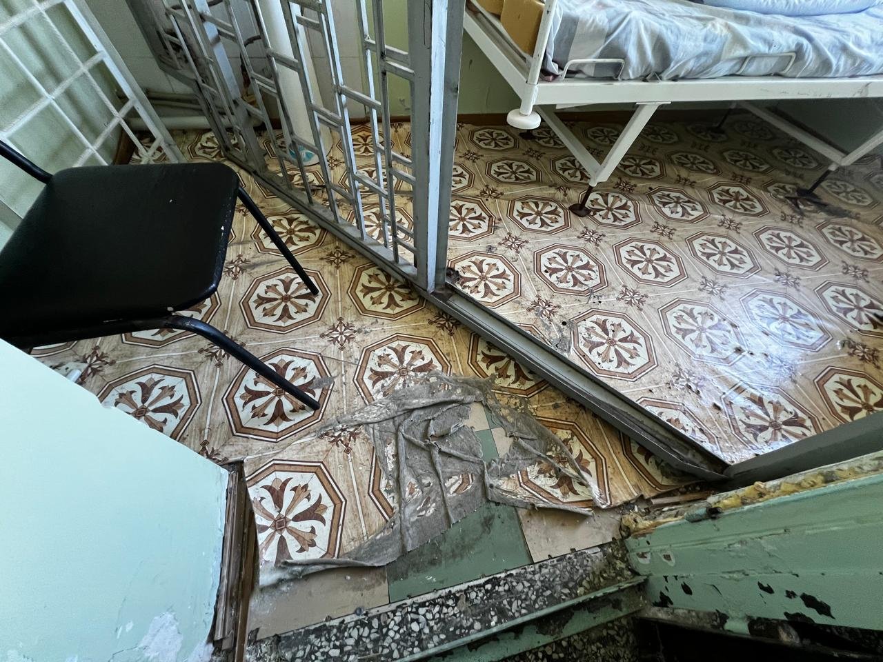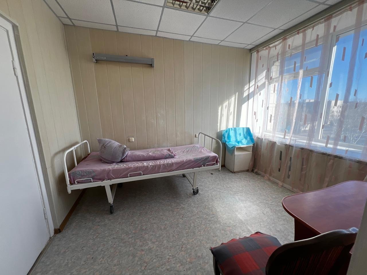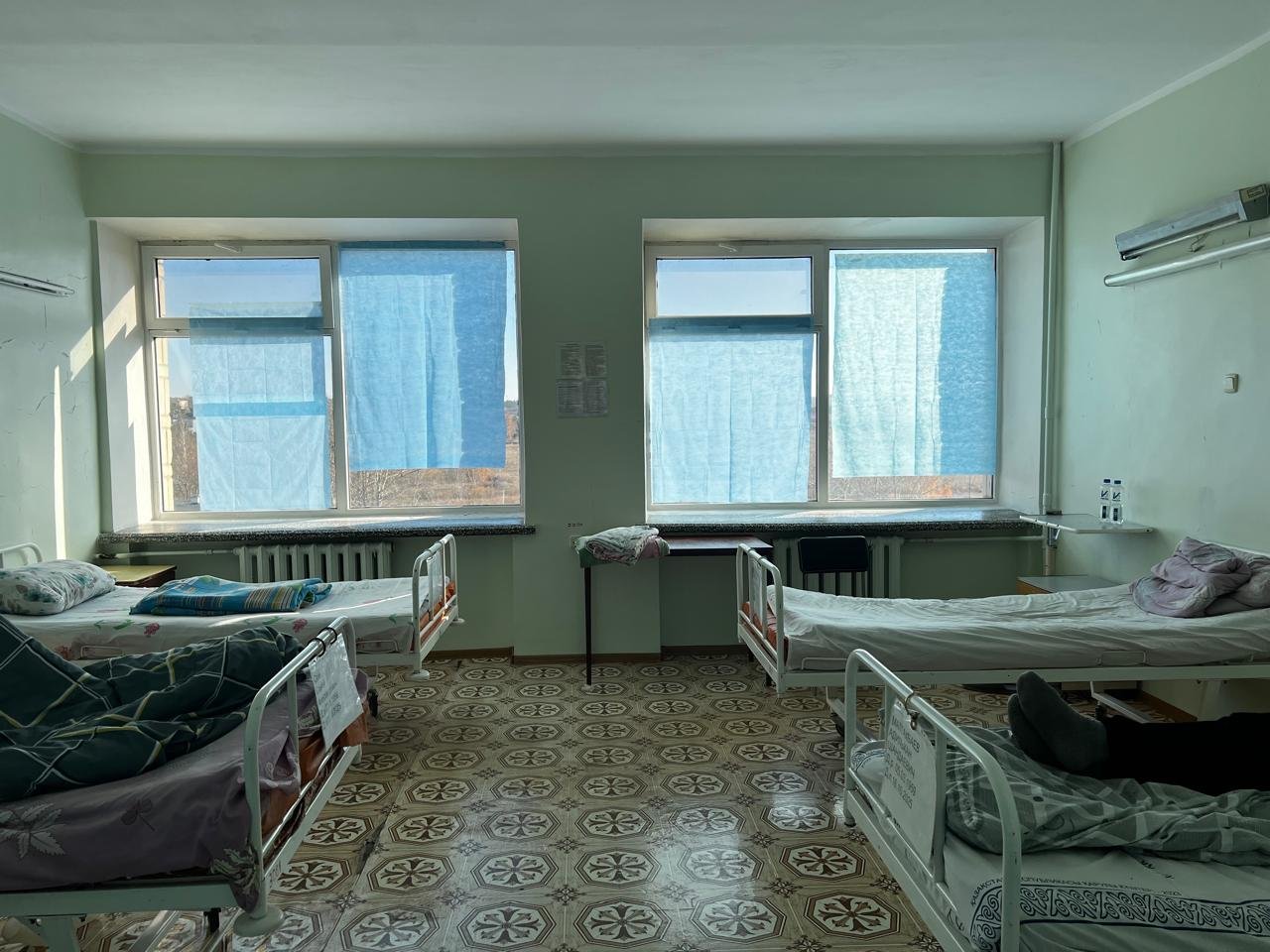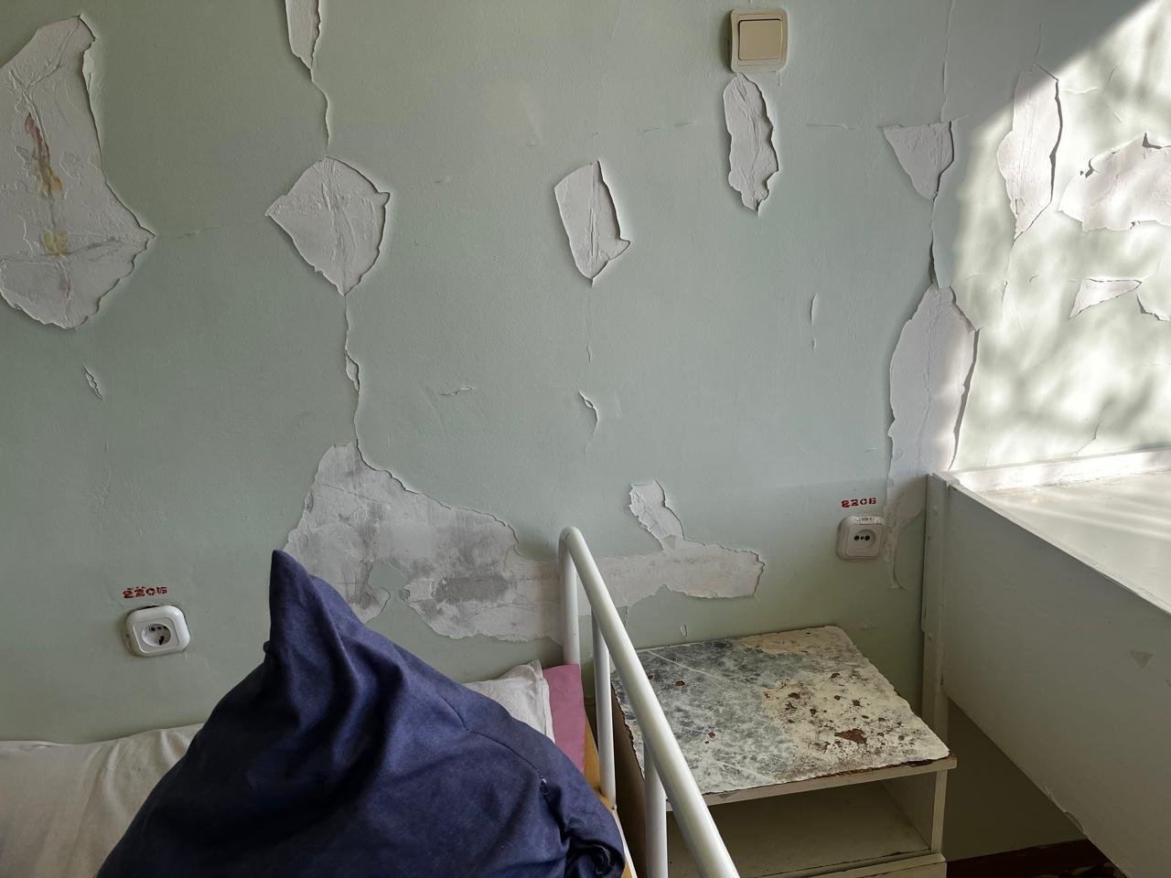 В палатах – стены с облупившейся краской. Старые, не раз перекрашенные двери. Не прибавляют уюта и окна, завешанные вместо жалюзи медицинской пелёнкой.