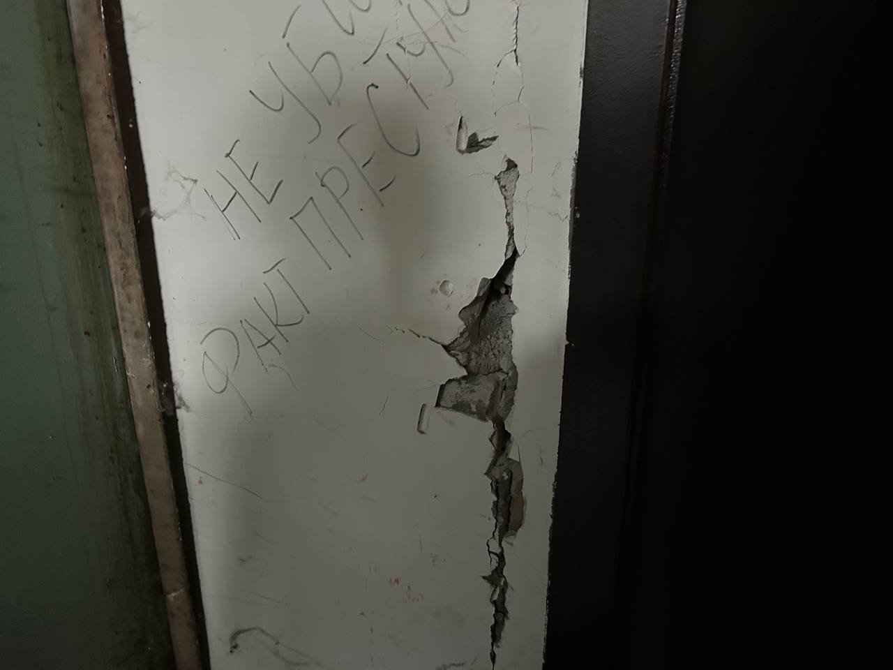 Калиева утверждает, что в помещении повредили стену, поэтому вырвалась розетка, и перекрыли воду.