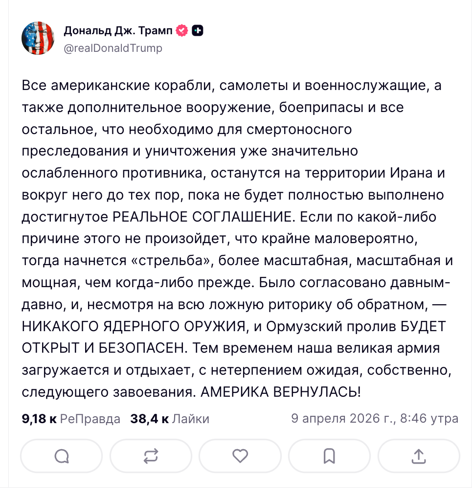 Дональд Трамп, между тем, 9 апреля в соцсети Truth Social вновь заявил, что США готовы нанести по Ирану более мощные удары, если Тегеран не выполнит условия договорённостей.