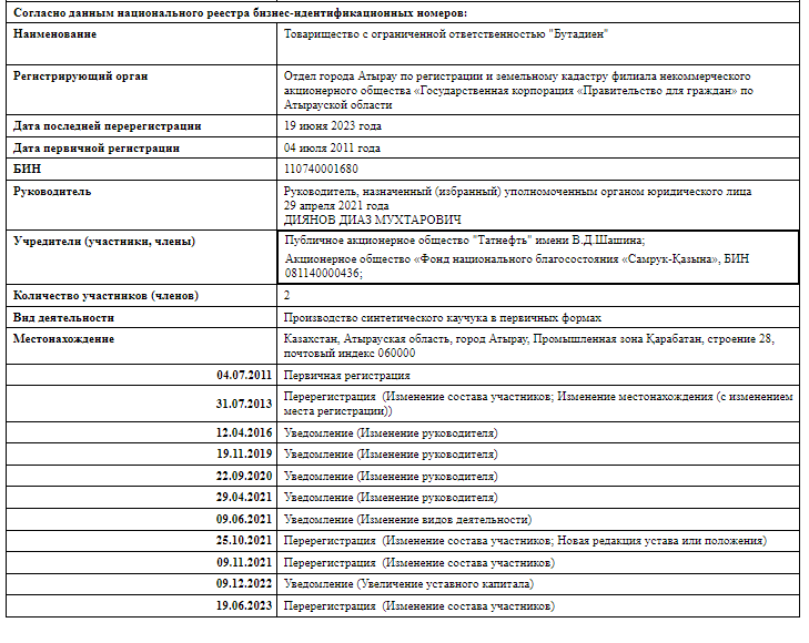 У ТОО "Бутадиен" 19 июня появился новый учредитель – национальный холдинг "Самрук-Казына", мажоритарный владельцем выступает российская "Татнефть"