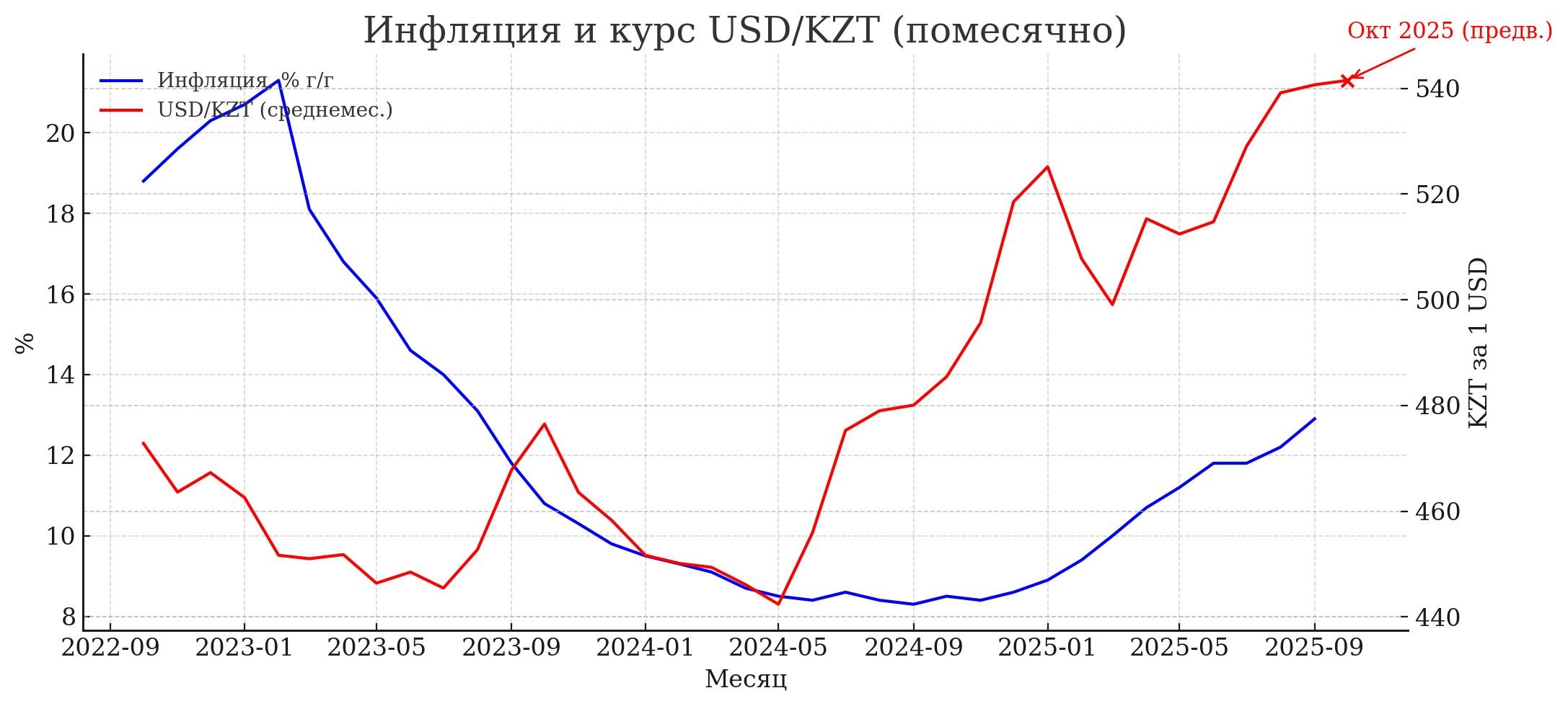 «Пост-ковидный инфляционный шок вызвал повышение ставки, и потом видно, что инфляция опустила голову и шла вниз, и НБ тоже начал снижать ставку. Но осенью прошлого года что-то поломалось, и инфляция „проснулась“. Реакция Нацбанка была точной и своевременной, и они опять стали поднимать ставку. Нынешний пик они чуть пропустили и среагировали только сейчас, возможно надо было ещё летом чуть нажать на тормоз, может не знали, что кто-то „жмёт на газ“»? Алмас Чукин