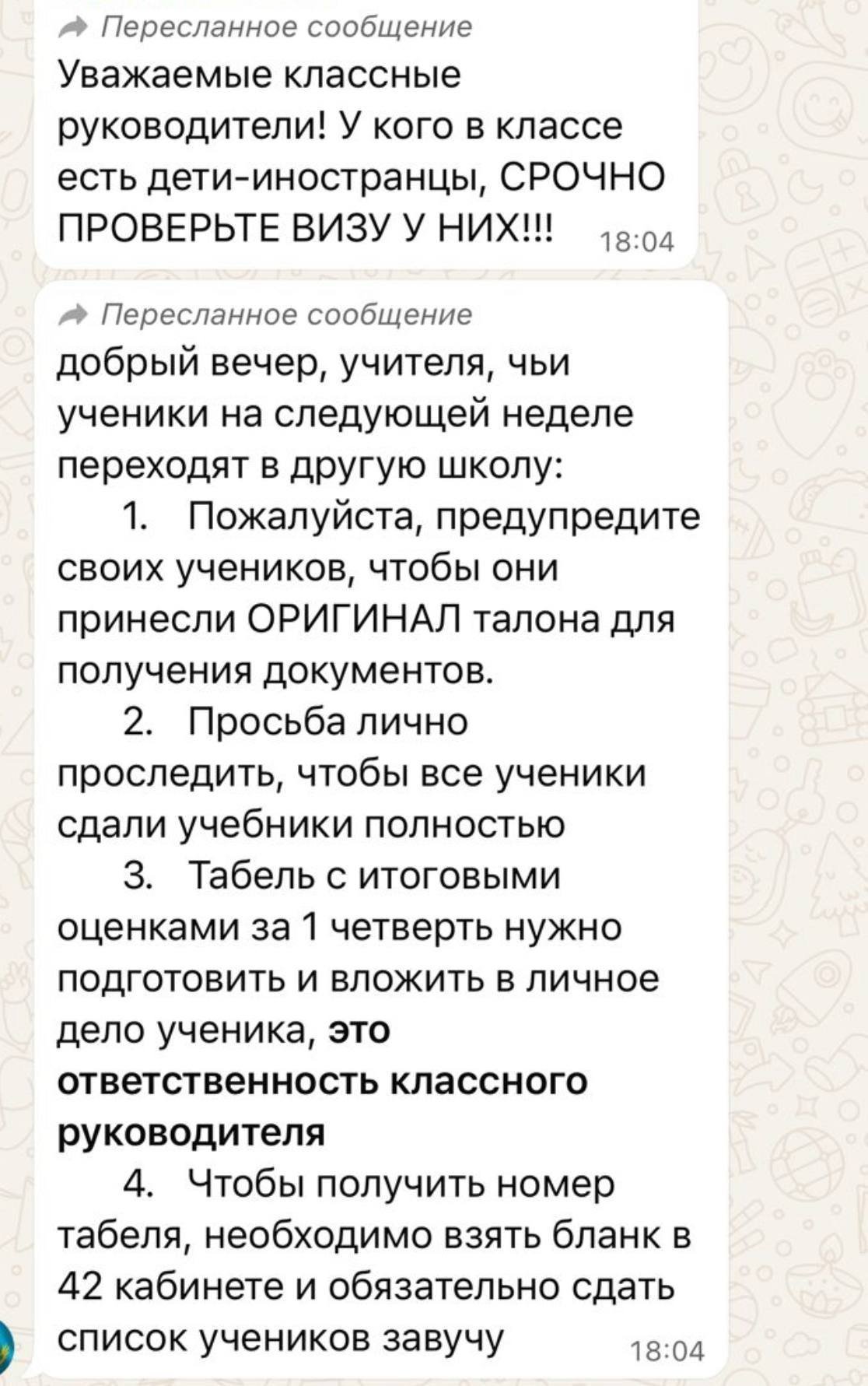«Это неправда. Школа не имеет права принимать иностранных граждан. Если иностранец хочет обучаться, он подаёт письменное заявление в управление образования. Заявление рассматривается, и при наличии мест его направляют в другую школу. Новый проект „Комфортные школы“ на эту категорию не рассчитан».