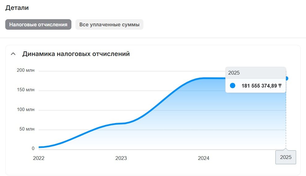 Компания показала рост, которому может позавидовать любой бизнесмен: за время существования она перечислила в бюджет 435 158 082,39 тенге. Если в 2022 году сумма выплат составляла около пяти миллионов, то к 2025 году она уже превысила 180 млн тенге. По оценкам Kompra.kz, взносы в фонд оплаты труда могут составлять около 406 миллионов тенге — показатель, сопоставимый с уровнем крупных игроков рынка. При этом штат компании не слишком велик.