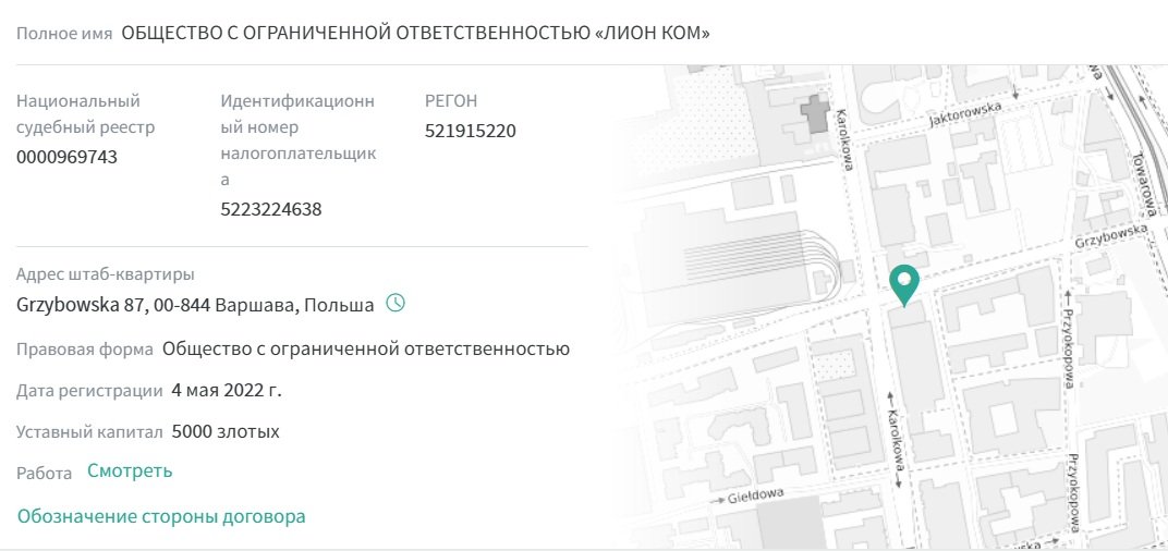 Польская структура LION COM Spółka z ograniczoną odpowiedzialnością (LION COM Sp. z o.o.) появилась на бизнес-карте 4 мая 2022 года — практически синхронно с запуском казахстанского филиала.