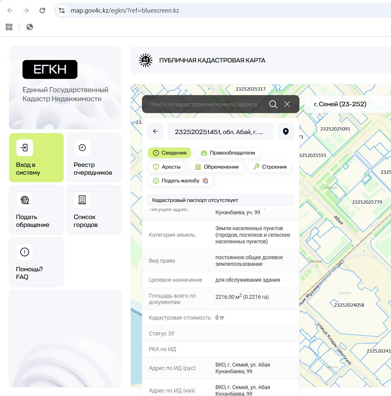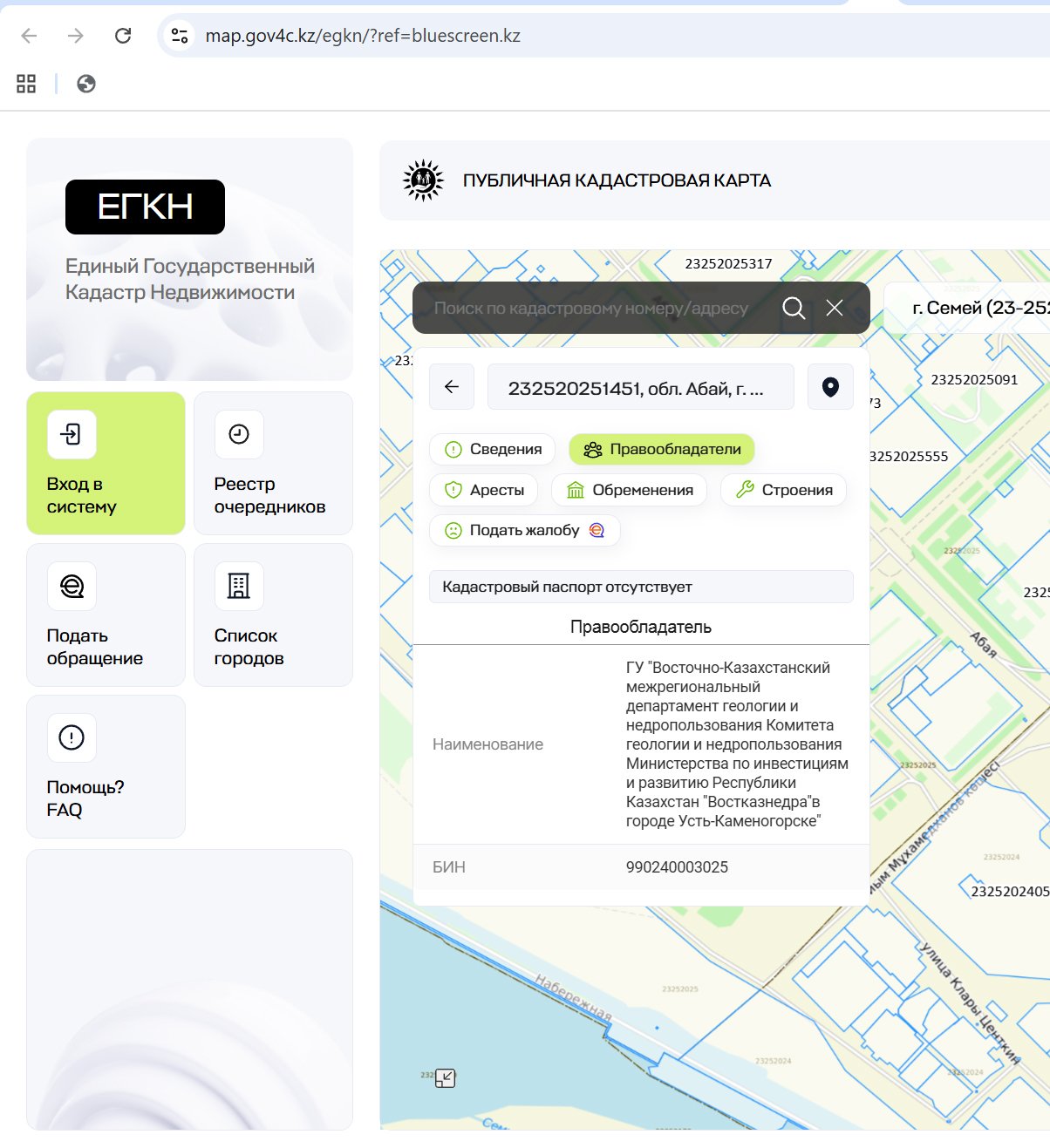 Согласно данным публичной кадастровой карты, обладателем участка является ГУ «Восточно-Казахстанский межрегиональный департамент геологии и недропользования Комитета геологии и недропользования Министерства по инвестициям и развитию Республики Казахстан „Востказнедра“ в городе Усть-Каменогорске».