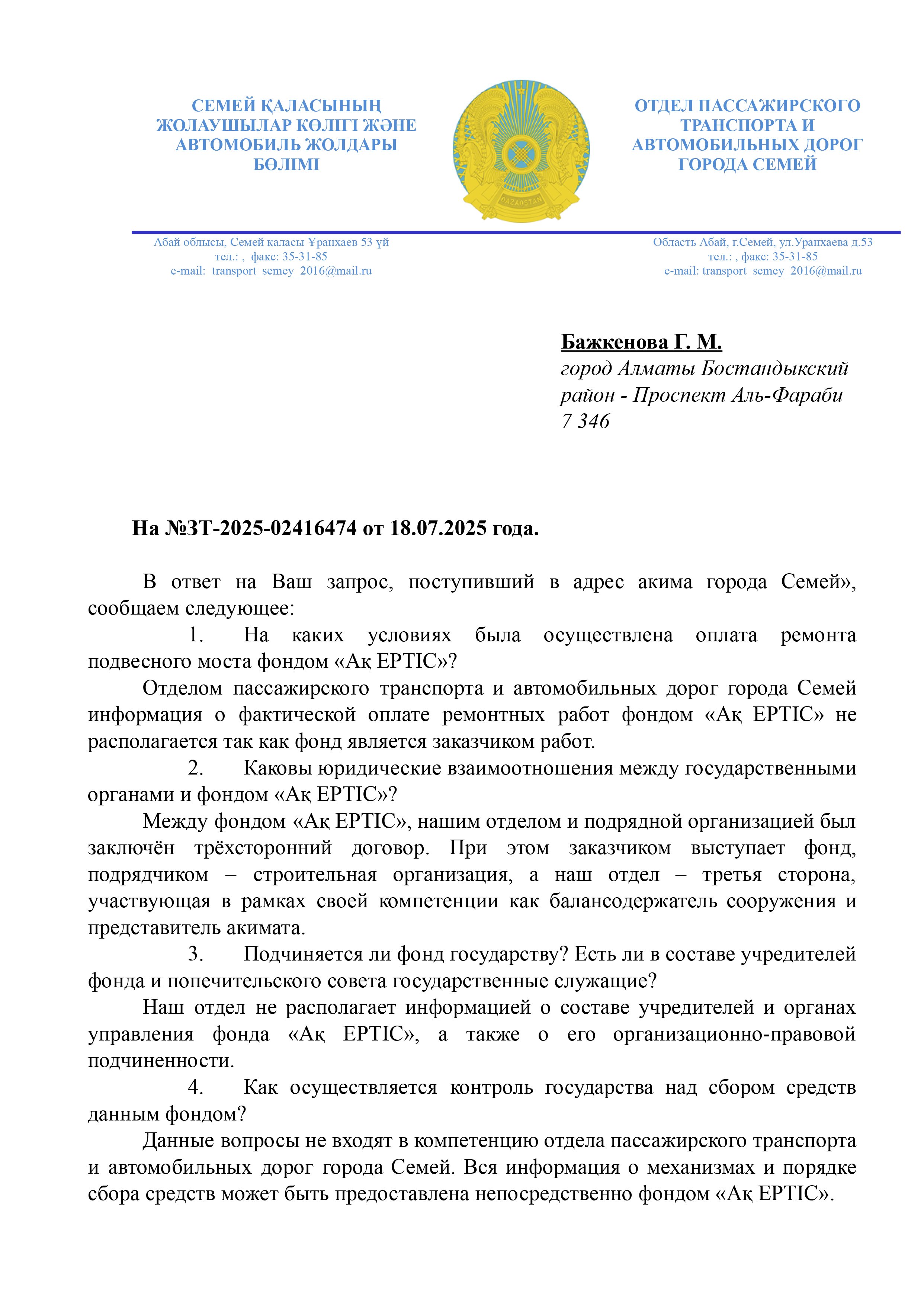 То есть некий малоизвестный общественный фонд решил сделать городу подарок. Отремонтировать за сотни миллионов подвесной мост. Из ответа отдела транспорта и автомобильных дорог Семея следует, что основную роль в этом ремонте играет «Ақ Ертіс», а отдел транспорта выступает лишь балансодержателем сооружения и представителем акимата.