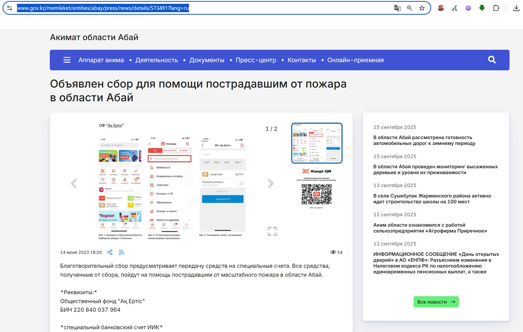 Последний кейс также немного объясняет работу «Ақ Ертіс». Как следует из скриншота выше, одним из организаторов сбора выступал акимат области Абай. В сборе приняли участие и акиматы других областей.