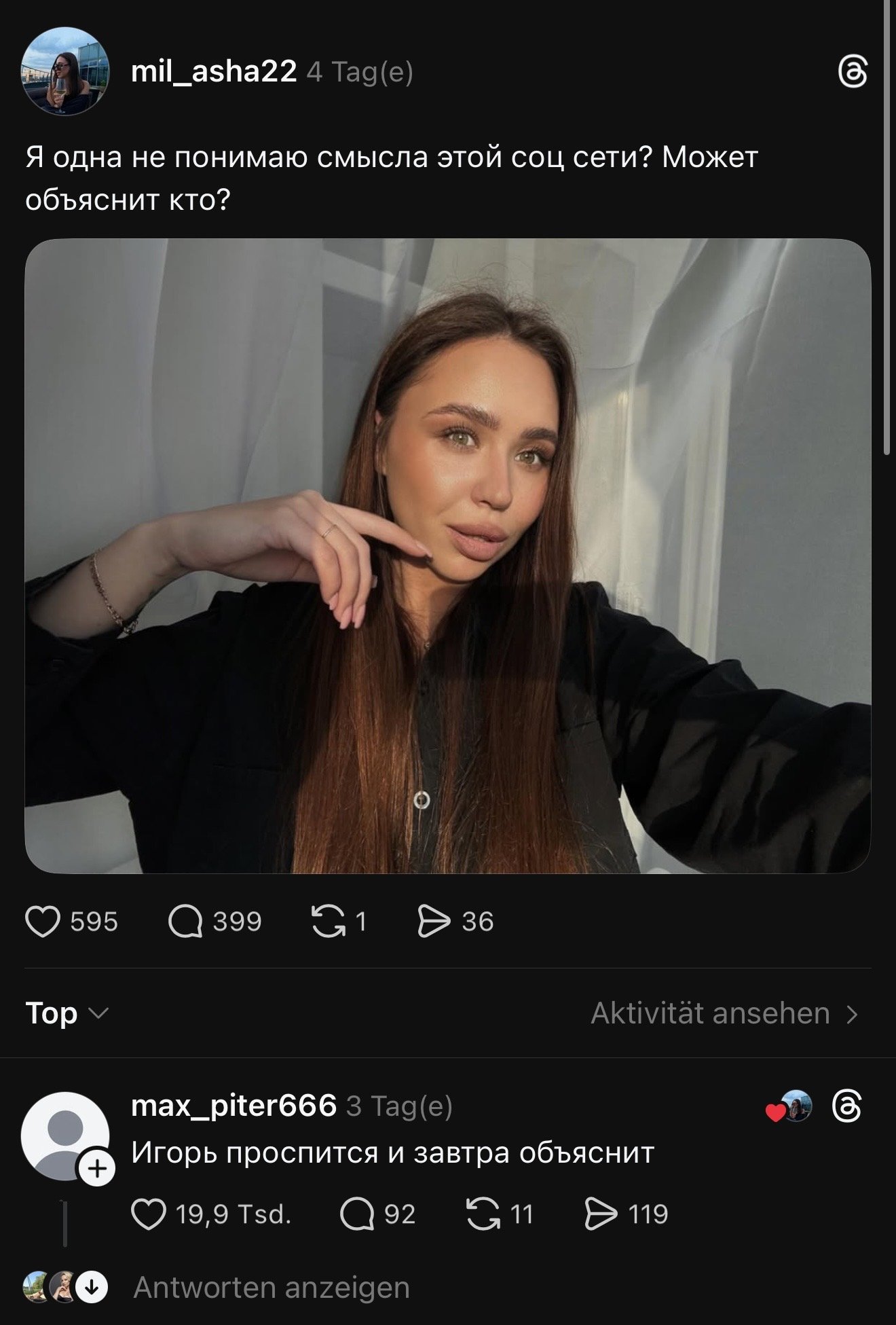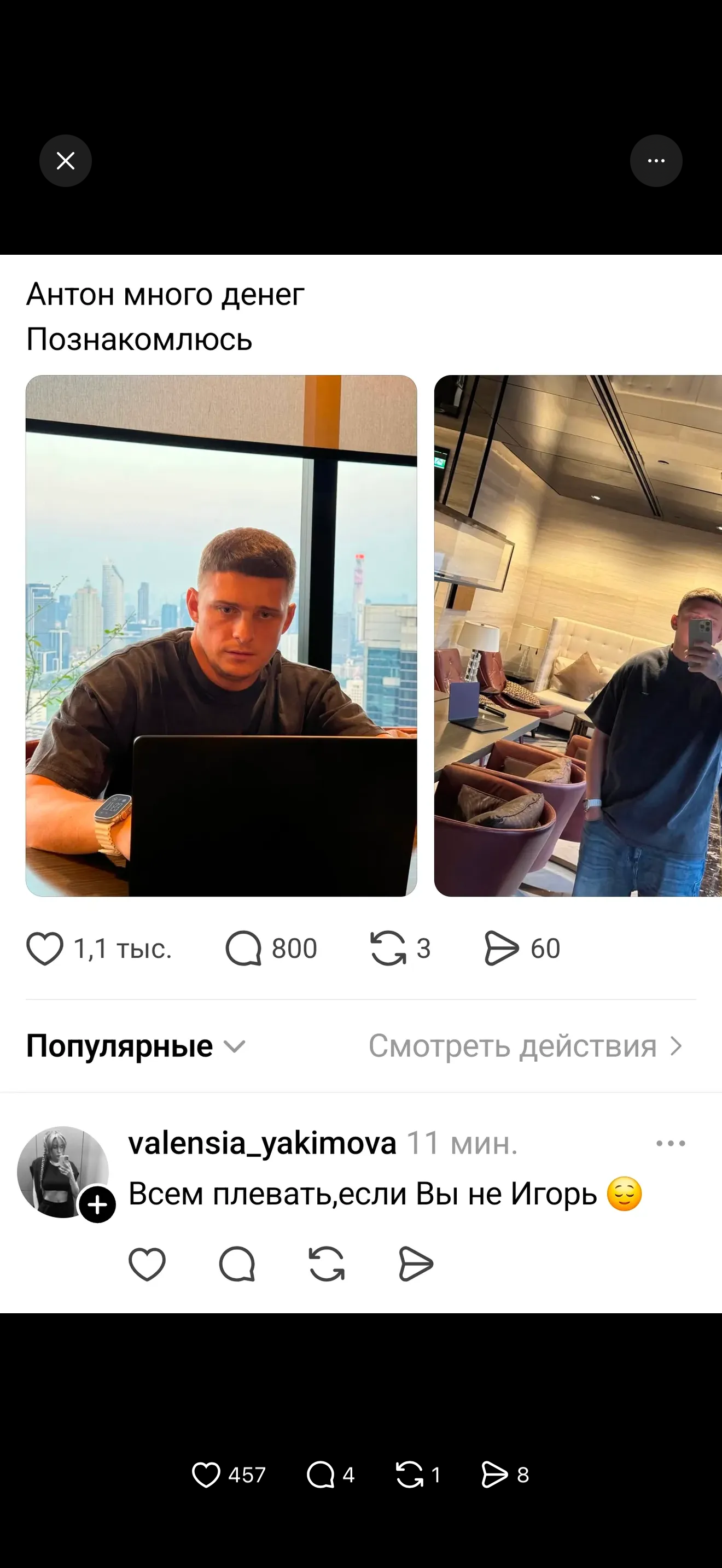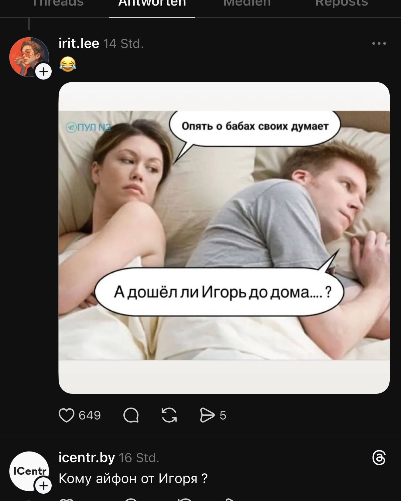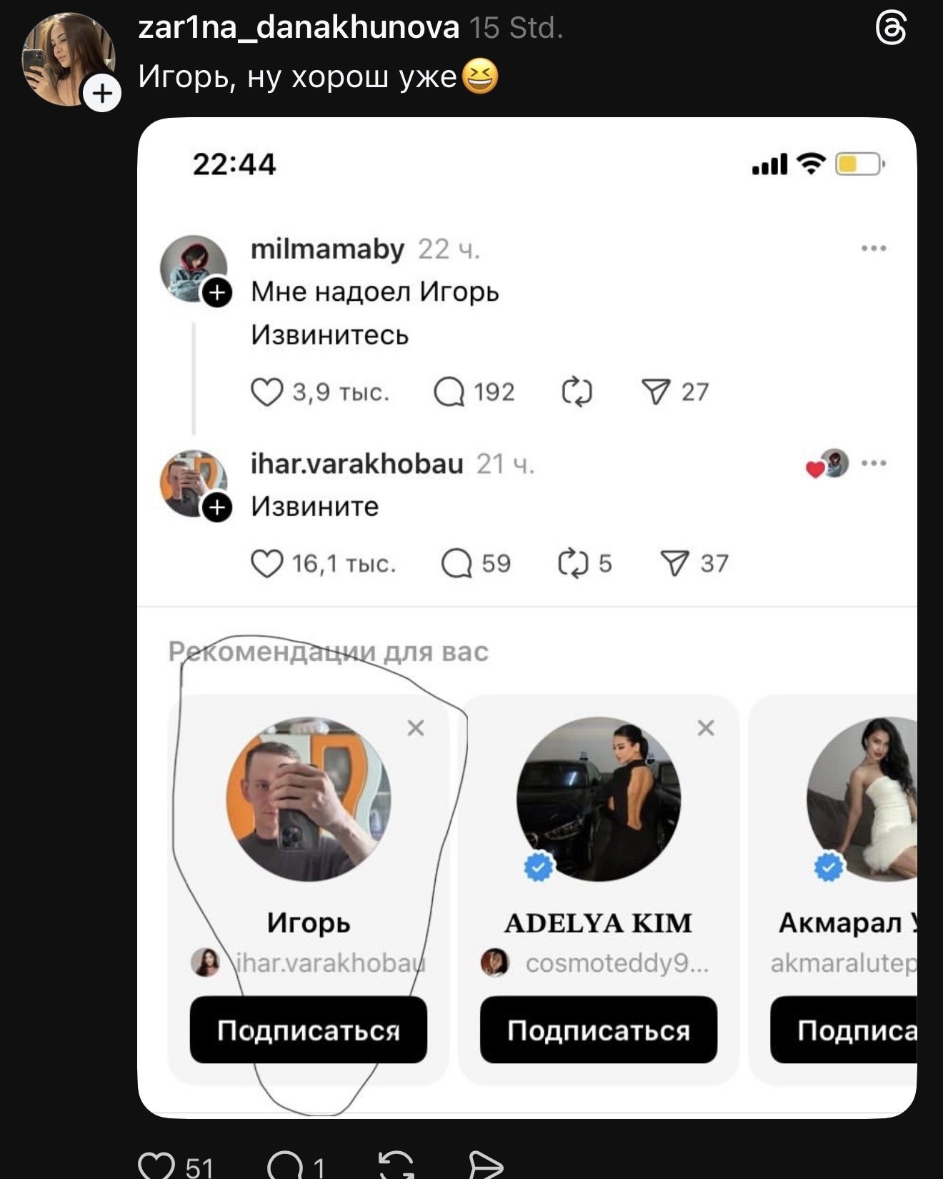 Обычно внезапно — как, например, в истории с неким Игорем из Белоруссии. На днях парень возвращался поздно ночью домой и опубликовал пост в Threads. Проснулся уже суперзвездой социальной сети. Под его публикацией сейчас около 150 тысяч лайков, тысячи комментариев и почти два десятка тысяч репостов.