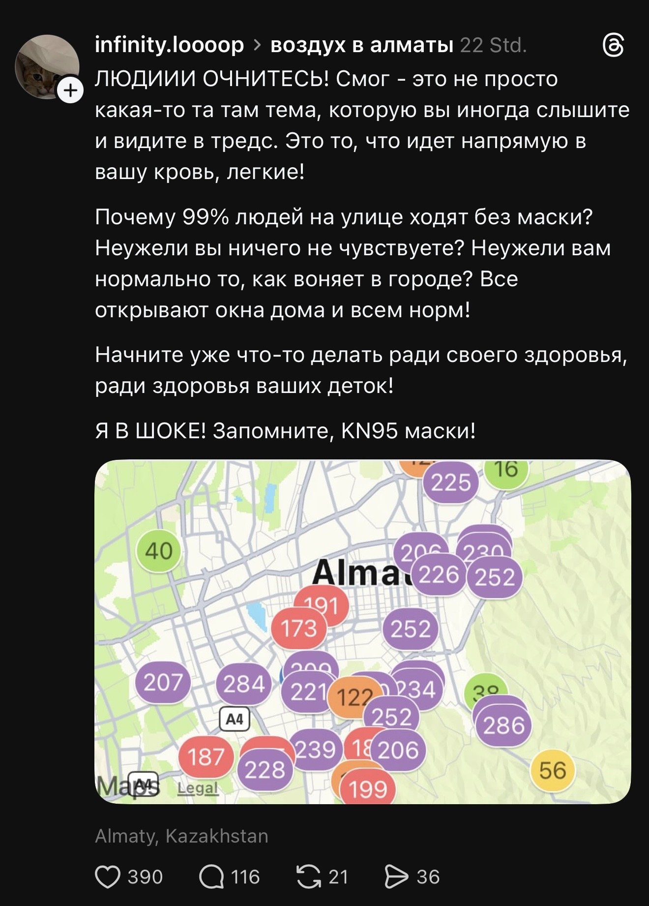 «Люди, очнитесь! Смог — это не просто какая-то тема, которую вы иногда слышите и видите в тредсе. Это то, что идёт напрямую в вашу кровь, в лёгкие! Почему 99 % людей на улице ходят без маски? Неужели вы ничего не чувствуете?»