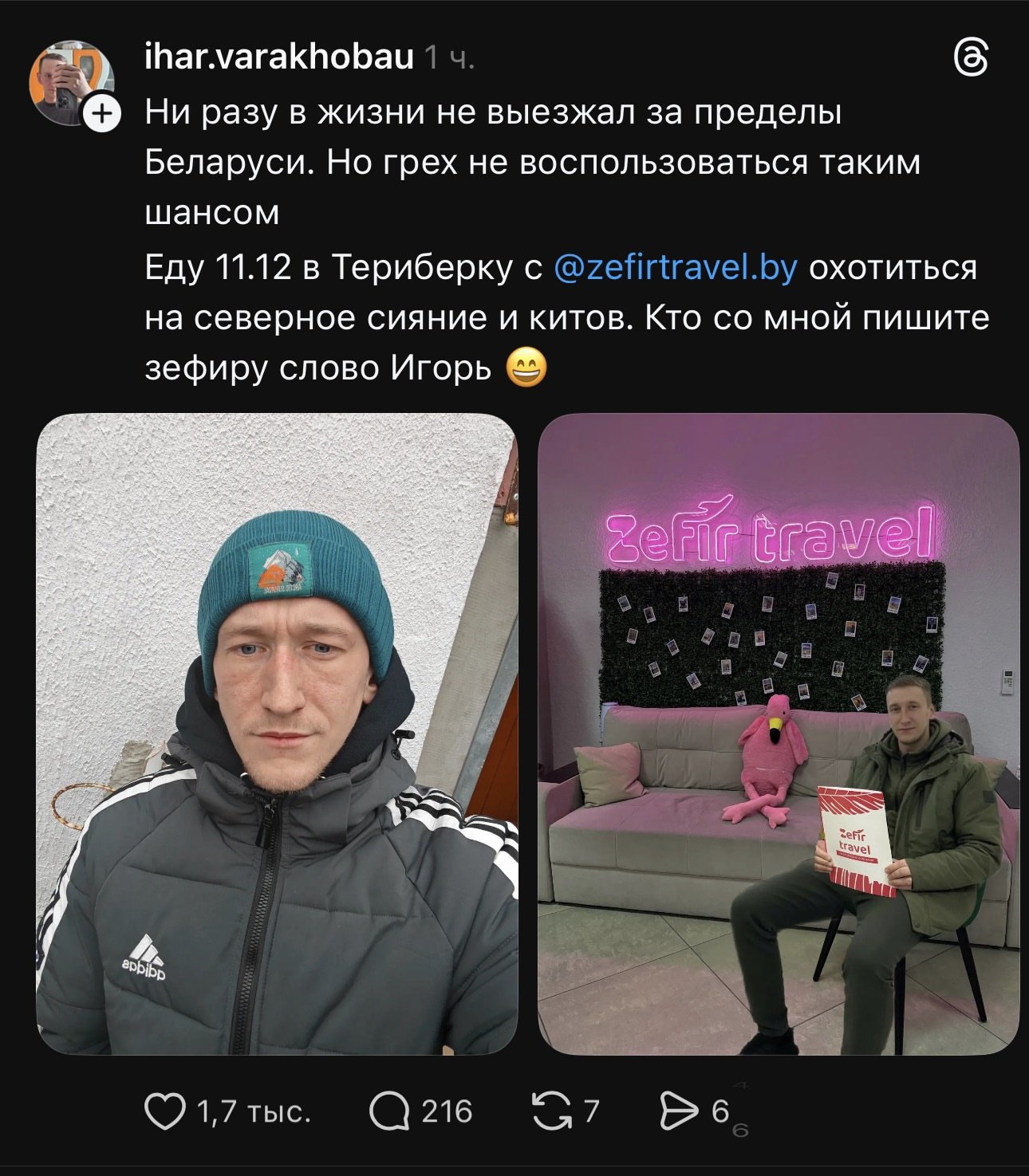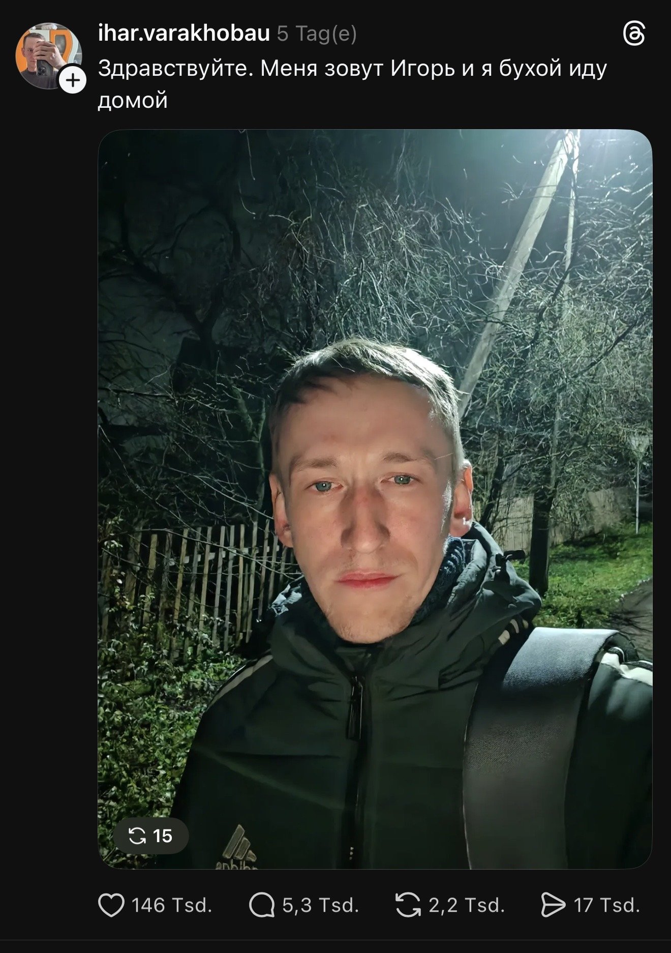 Обычно внезапно — как, например, в истории с неким Игорем из Белоруссии. На днях парень возвращался поздно ночью домой и опубликовал пост в Threads. Проснулся уже суперзвездой социальной сети. Под его публикацией сейчас около 150 тысяч лайков, тысячи комментариев и почти два десятка тысяч репостов.