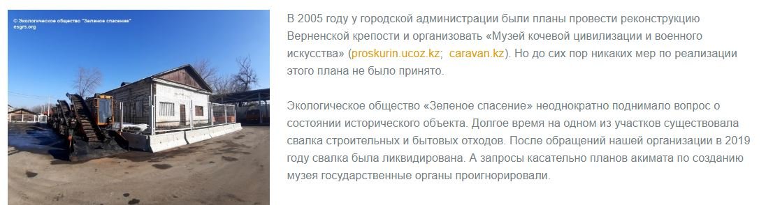 Ещё в 1990-е годы территория Верненской крепости (относится к Жетысускому району Алматы) была разделена на несколько частей, все они — в частной собственности.