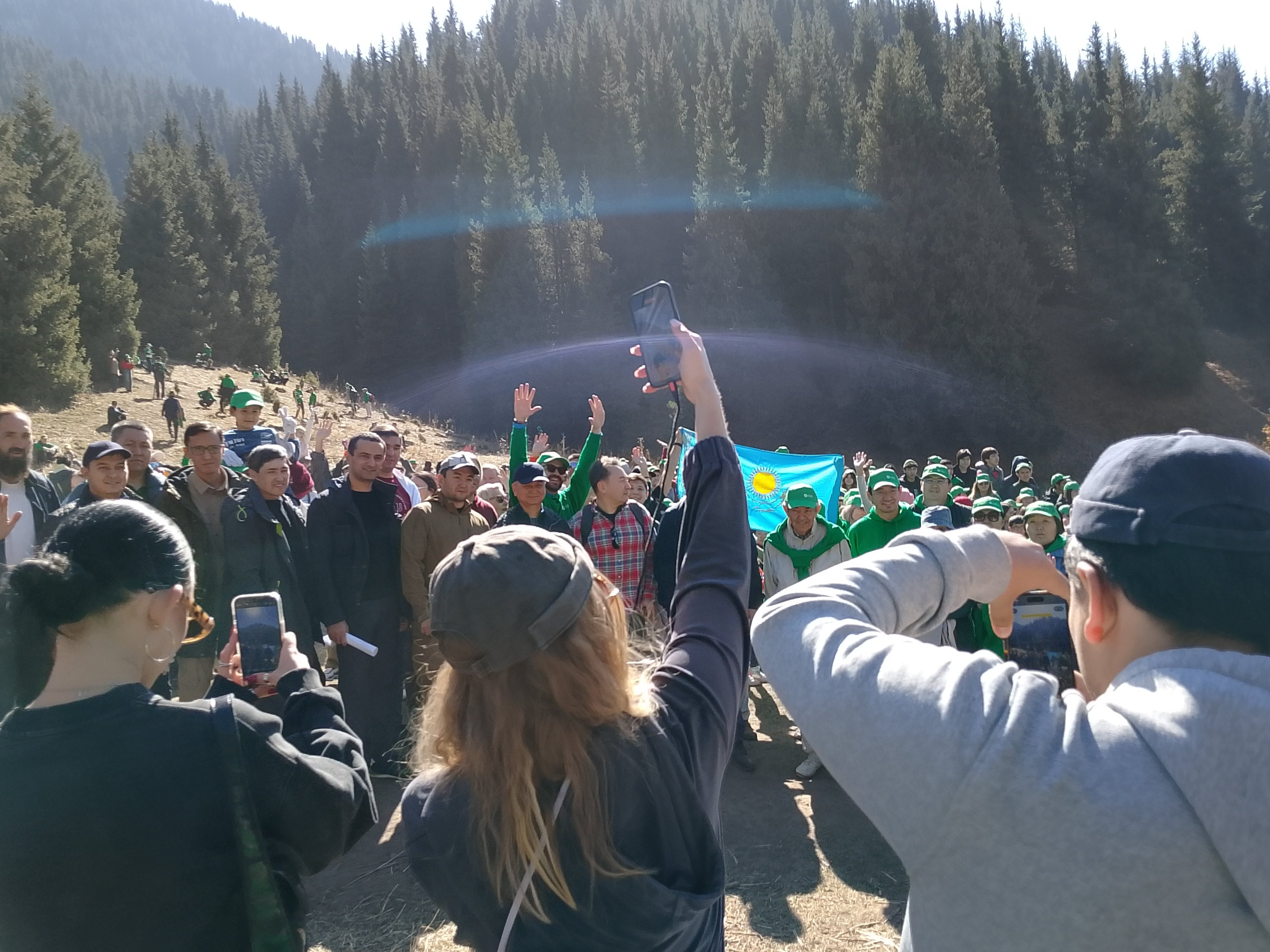 Речи прозвучали, а значит, пришло время сажать. Внимание людей перехватил ведущий, чтобы разрядить обстановку. Перед тем как приступить к посадке елей, он попросил участников прослушать краткий инструктаж инспекторов Иле-Алатауского национального парка. Но перед этим сделать ещё одну красивую фотографию.