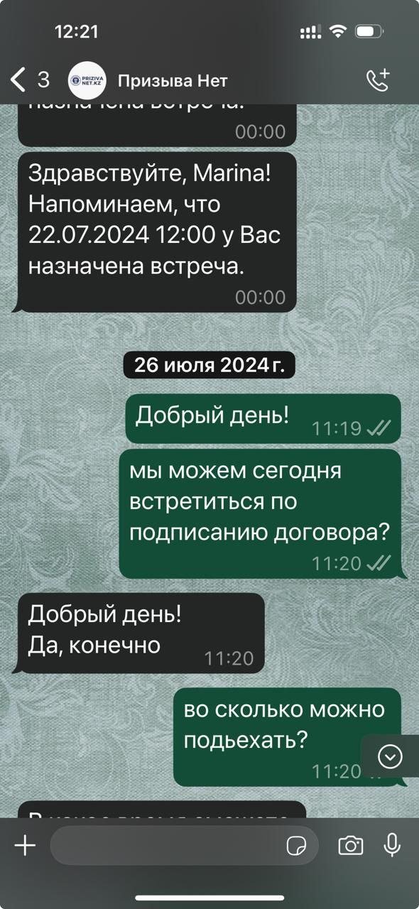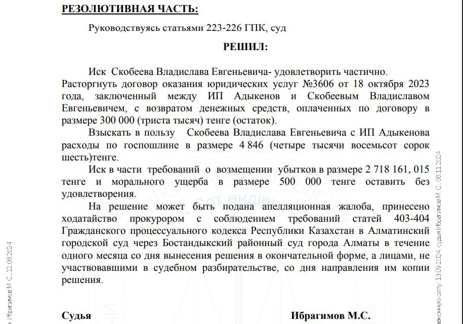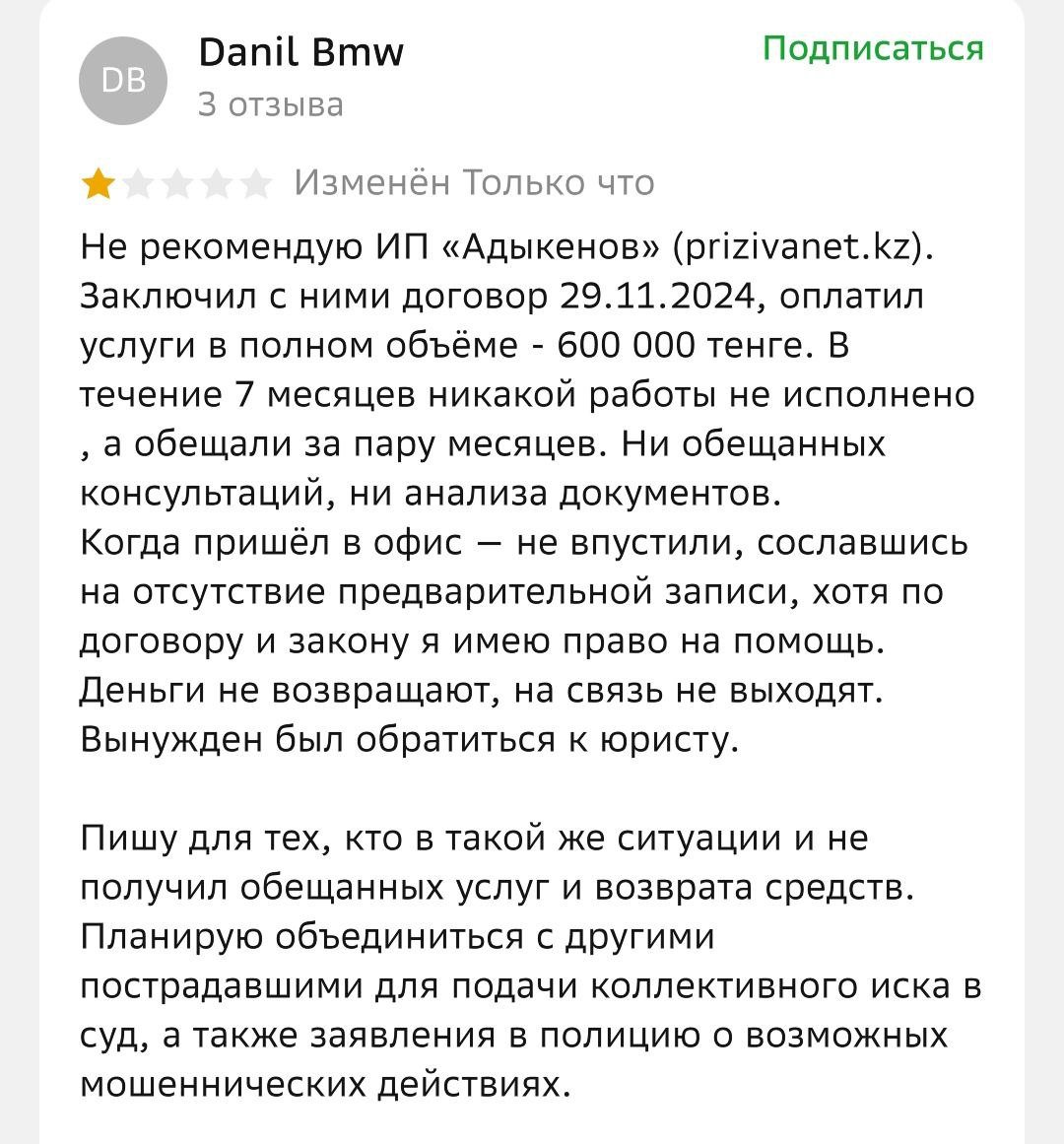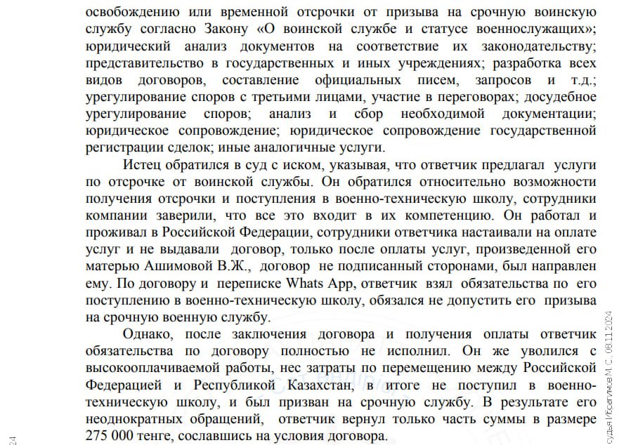 В прошлом году на ИП «Адыкенов» (именно так зарегистрирована организация) подали в суд. Владислав Скобеев заключил договор с Prizivanet в 2023 году. В это время он жил в России. Парень хотел получить отсрочку от армии и поступить в военно-техническую школу. Но договор (и то без подписей) не высылали вплоть до оплаты. Стоимость услуг оценили в 575 тысяч тенге. Парню пообещали сделать всё в лучшем виде. Но компания не выполнила условия договора.