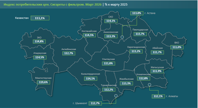 Сильнее всего сигареты стали дороже в Мангистауской области — на 19,6 %. В числе регионов с высоким ростом цен также оказались Западно-Казахстанская (14,8 %), Атырауская и Костанайская области (по 14,5 %). Минимальный рост зафиксировали в Восточно-Казахстанской и Улытауской областях — около 11 %.