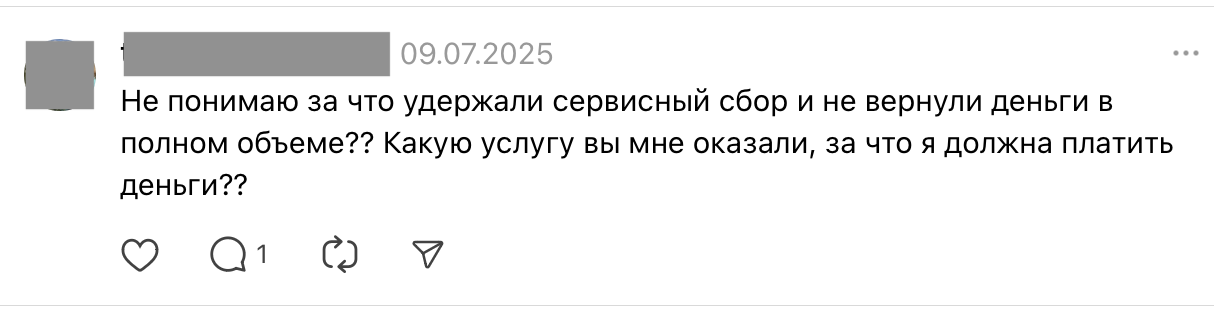 После отмены тысячи зрителей, купивших билеты, обнаружили, что возвращается только номинальная стоимость билета — без 10-процентного сервисного сбора. В 2GIS рейтинг компании стремительно просел под волной гневных отзывов. Однако представители сервиса стоят на своей правоте. Они считают, что их работа выполнена, а покупатель добровольно согласился на их условия в момент покупки.