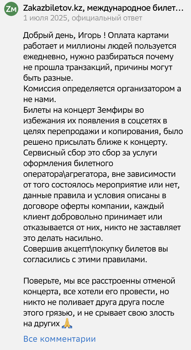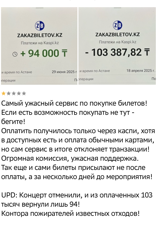 Поклонники Земфиры, купившие билеты на её концерт, который должен был состояться 6 июля в Алматы, столкнулись с проблемой: вернуть сервисный сбор за отменённое мероприятие оказалось невозможно. Билетный оператор Zakazbiletov.kz оставил себе 10-процентную комиссию, ссылаясь на условия оферты. Это вызвало волну негодования. Orda.kz выясняла, законно ли это.