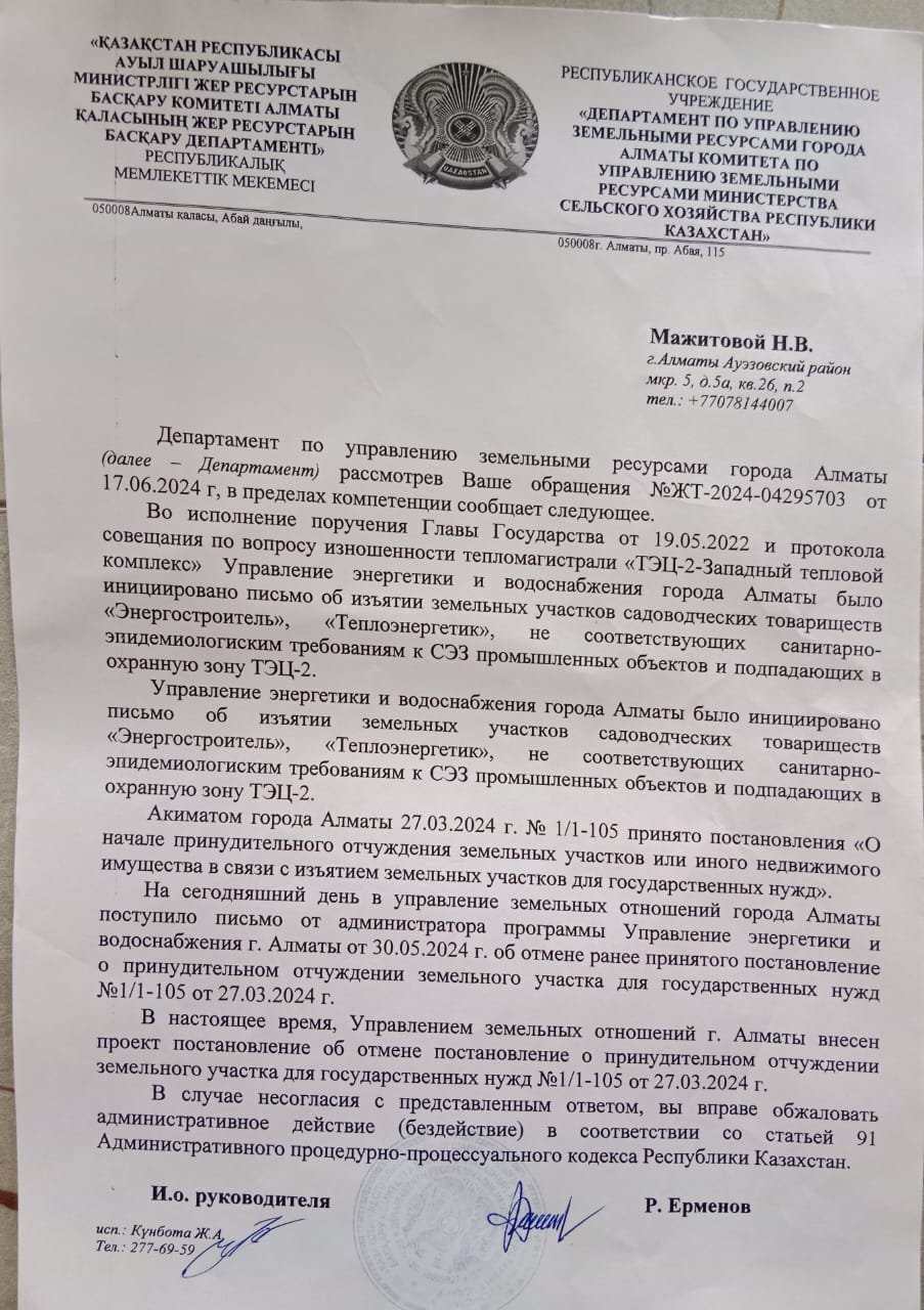 А в ответе акимата Алматы, точнее, управления земельных отношений (УЗО) уточняется, что «мероприятия по принудительному отчуждению земельных участков проводятся исключительно для государственных нужд в целях строительства транспортной инфраструктуры (дорог, развязок), социальных объектов (школ, детсадов, больницы и т. д.) и объектов энергетики».