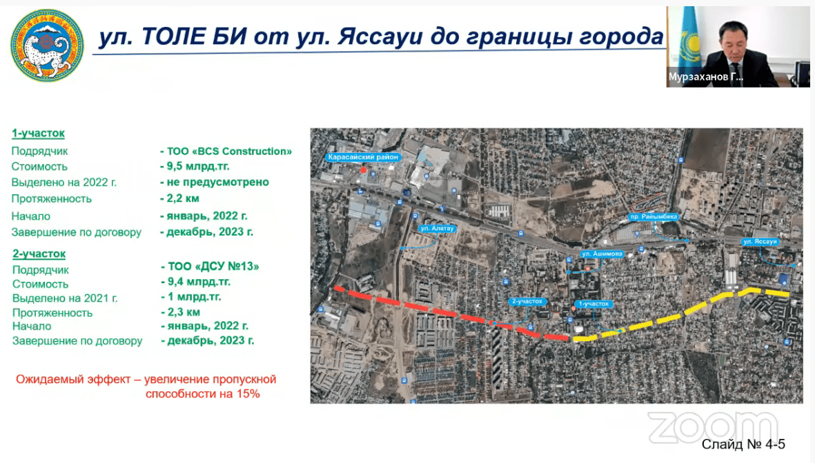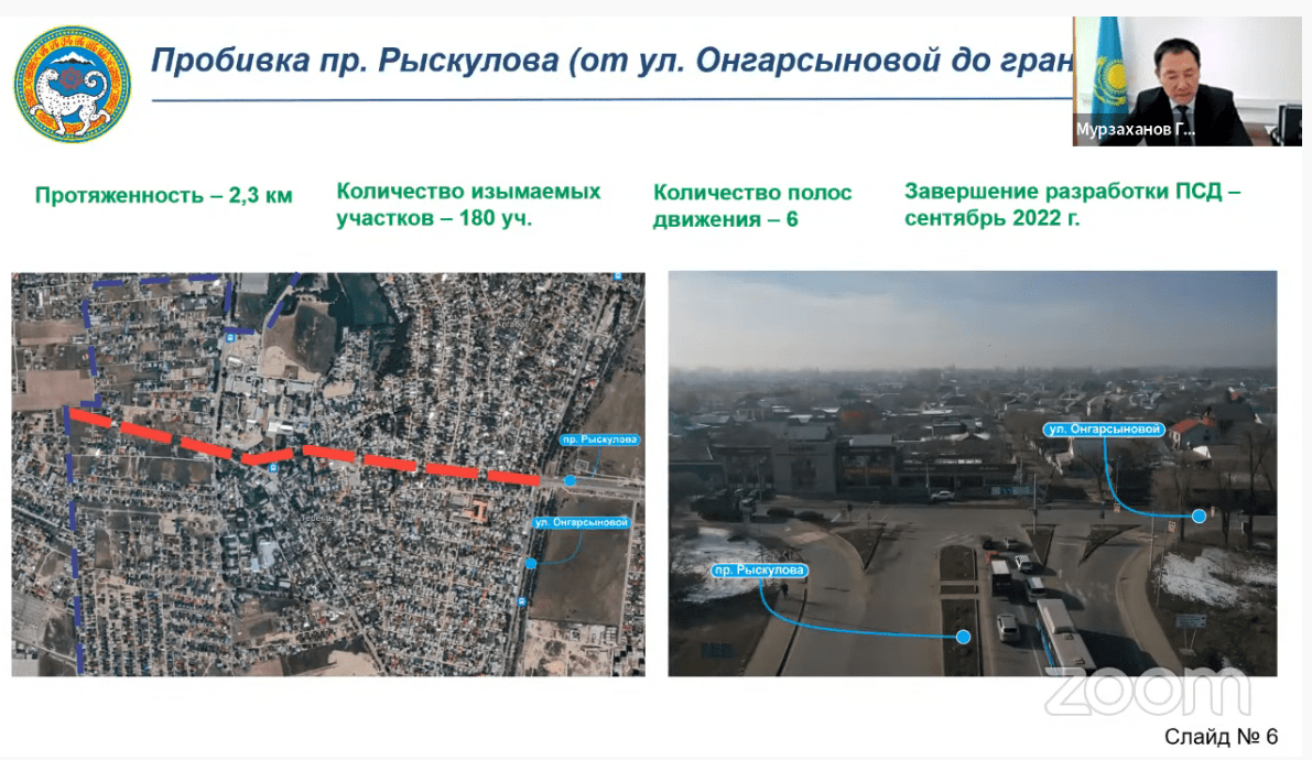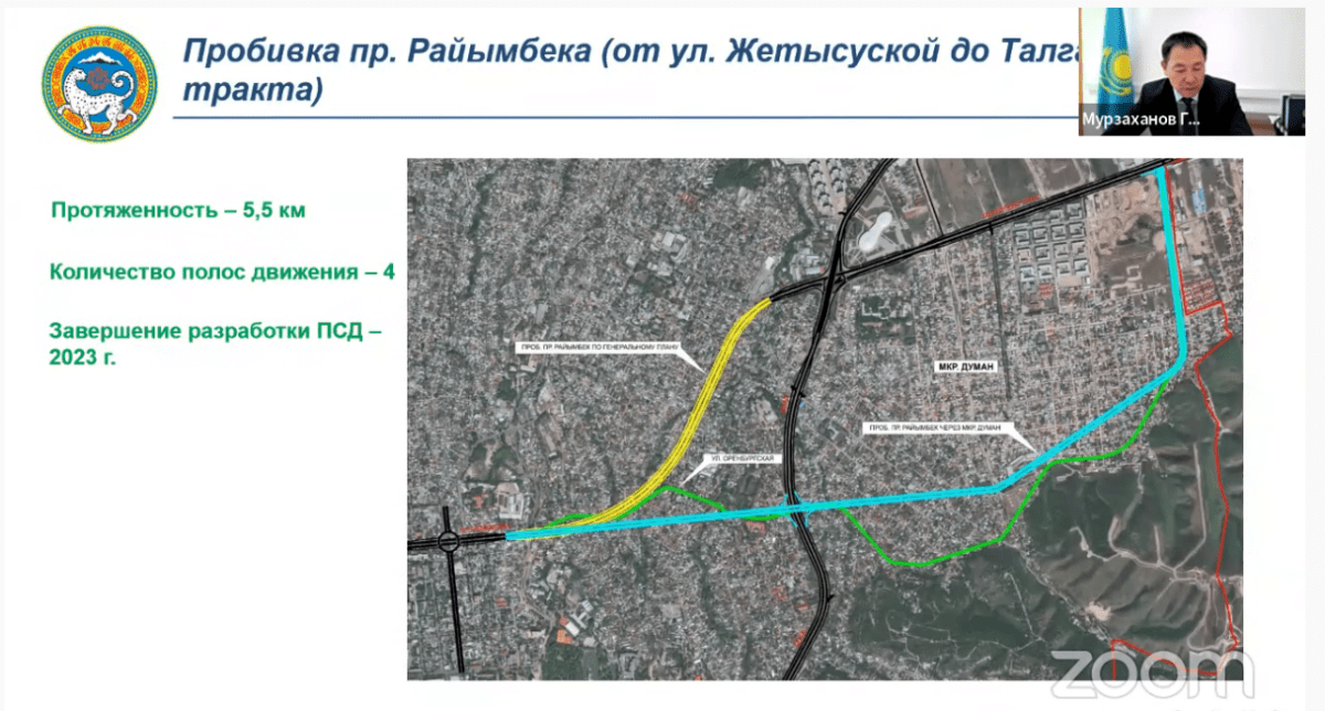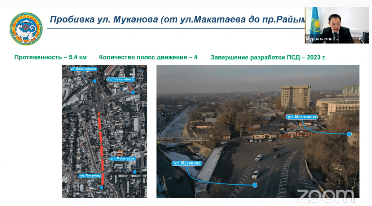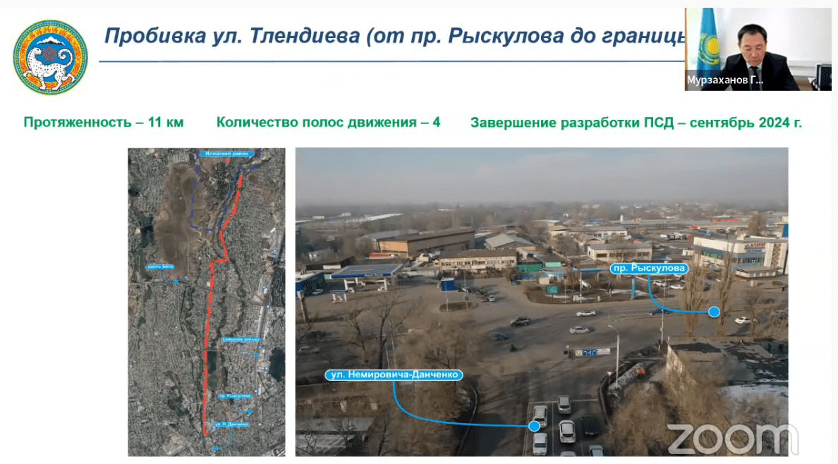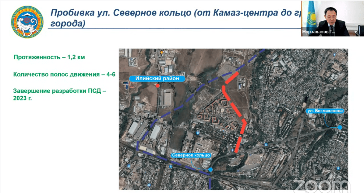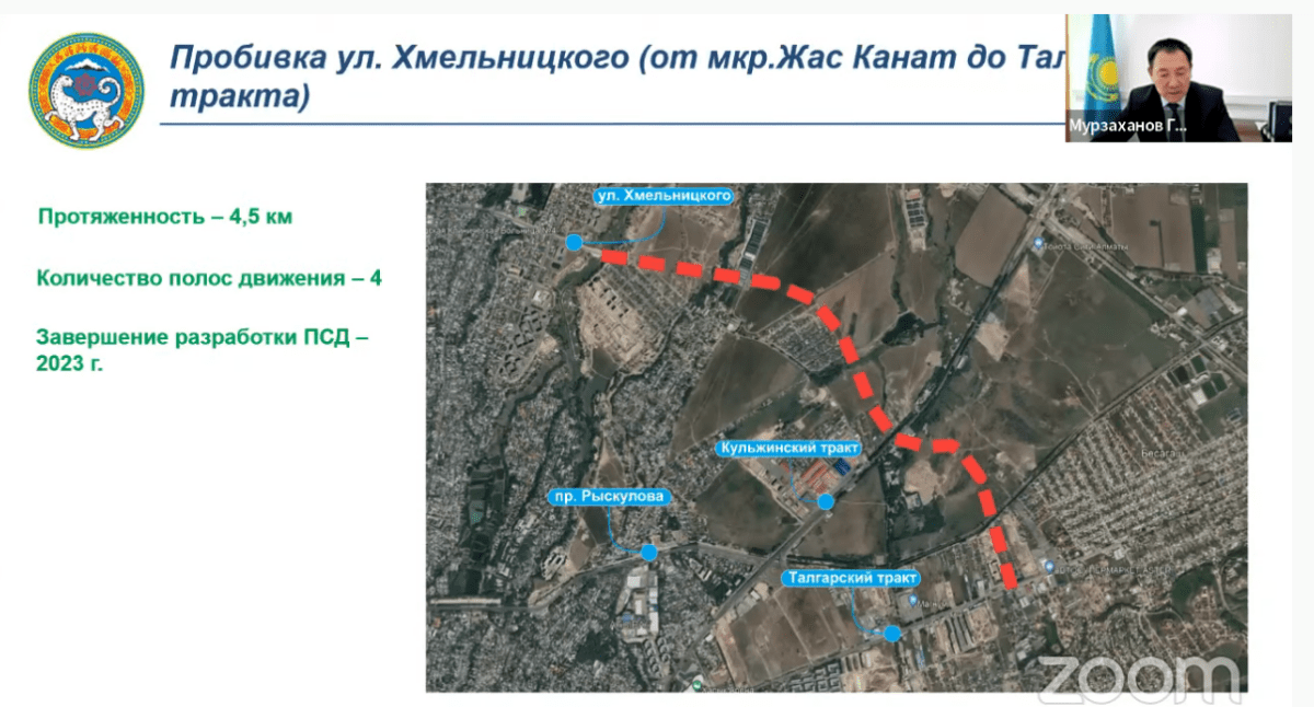 В настоящее время уже ведутся работы по пробивке улицы Саина. В скором будущем ожидается пробивка следующих артерий города: улица Толе би от улицы Яссауи до границы города, проспект Рыскулова от улицы Онгарсыновой до границы города, улица Кажымуканова от проспекта Назарбаева до Сейфуллина, улица Жубанова от улицы Момышулы до границы города, проспект Райымбека от улицы Жетысуской до Талгарского тракта, улица Хмельницкого от микрорайона Жас Канат до Талгарского тракта, улица Муканова от улицы Макатаева до Райымбека, улица Тлендиева от проспекта Рыскулова до границы города, улица Северное кольцо от Камаз-центра до границы города.